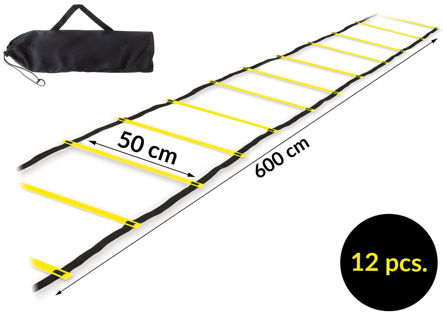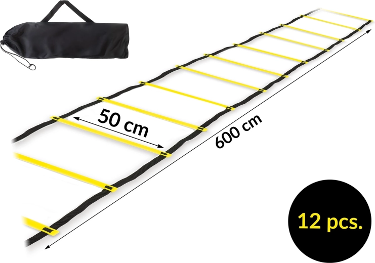 Ekstremt holdbar koordinationsstige med 12 justerbare trin og længde op til 6 m, ideel til træning af fart, agility og koordination. Let konstruktion af slidstærk PVC og PE-remme gør den nem at transportere, og den justerbare afstand mellem trinene tilpasser sværhedsgraden af træningen. Inklusive praktisk opbevaringsetui med hank gratis.