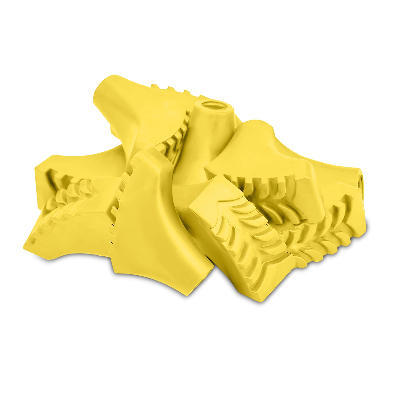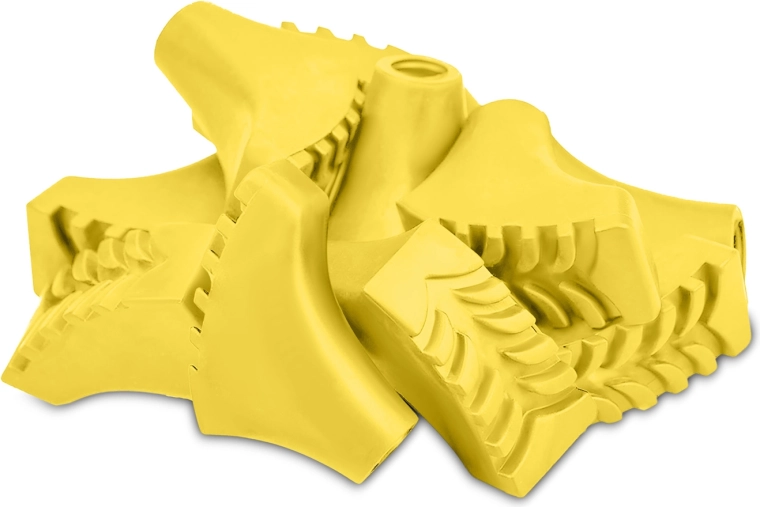 Universelle gule dupper til nordic walking-stave i pakke med 10 stk for behagelig gang på forskellige underlag. Takket være det dybe mønster af slidstærk gummi giver de pålidelig friktion, bedre stabilitet og støddæmpning på asfalt, i skoven, på stranden og i sne. Hurtig udskiftning muliggør lynhurtig tilpasning til skiftende forhold.