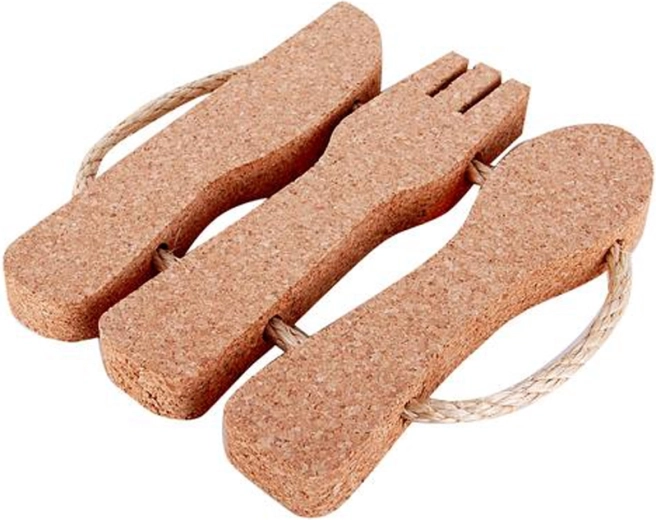 Dette dekorative underlag af naturlig kork er designet i form af bestik, hvilket gør det til et originalt tilbehør i ethvert køkken eller spisestue. Det giver pålidelig beskyttelse af overflader mod varme gryder og fade og tilfører samtidig det dækkede bord et unikt udtryk.