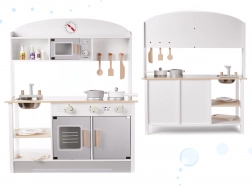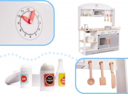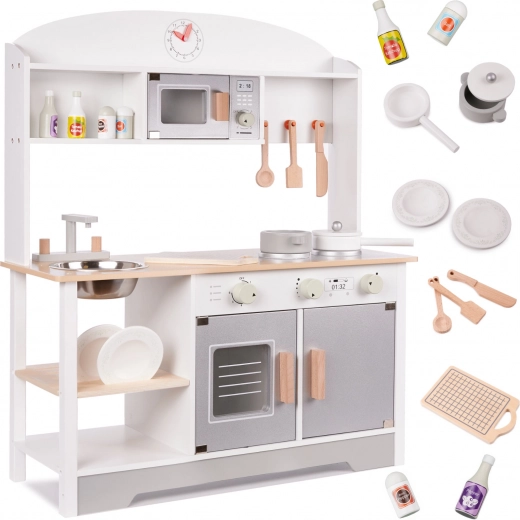 Stilfuldt trælegetøjskøkken i MDF i neutrale farver, der giver timevis af kreativ leg. Det har en aftagelig vask i metal, kogeplader med drejeknapper, ovn med vindue og display, mikrobølgeovn samt opvaskestativ. Inkluderer rigt trætilbehør (gryde, pande, tallerkener, kniv, ske, palet og krydderikrukker) samt praktiske kroge og hylder til opbevaring. Sikkert, glat slebet og malet med giftfri farver.