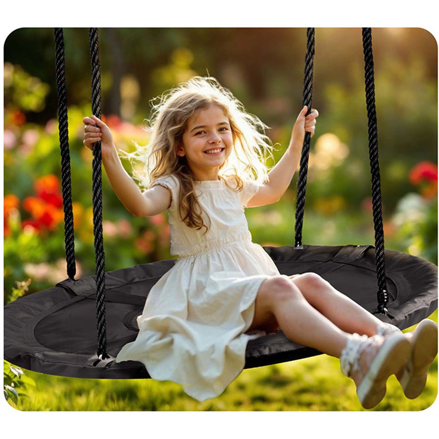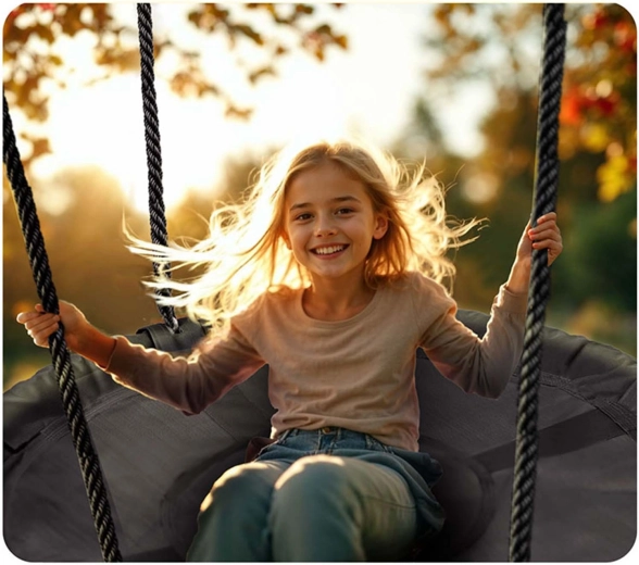 Takket være de justerbare ophængsreb tilpasser du nemt gyngens højde til barnets alder og højde – sikker sjov, der vokser med barnet. Den robuste konstruktion med en bæreevne på op til 150 kg gør det muligt for flere børn at gynge samtidig eller for afslappet loungen.