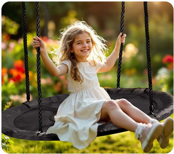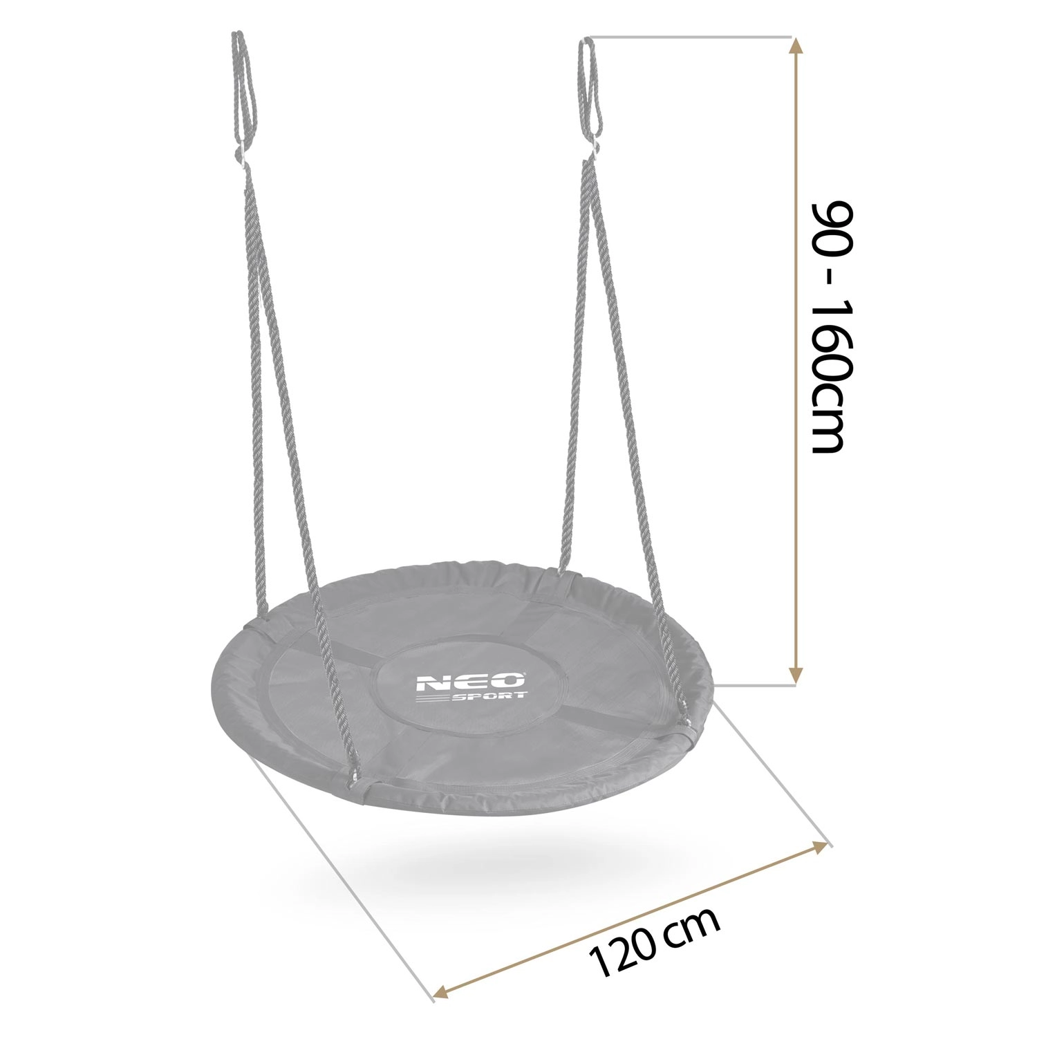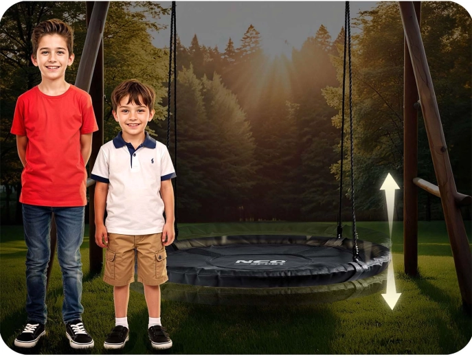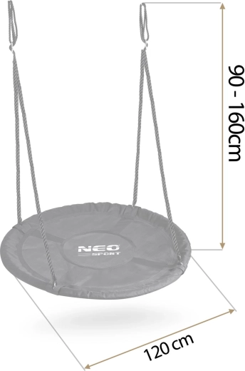 Oplev den rummelige, runde redegynge med en diameter på 120 cm fra NEO SPORT til sjov for både børn og voksne. Den tilbyder behagelig siddekomfort, vandafvisende betræk i Oxford 600D, kraftig stålramme med skumomvikling og stærke, justerbare ophængsreb for sikker og stabil gyngning op til 150 kg.