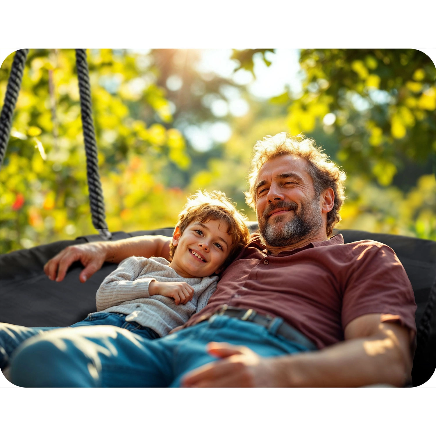 Stålrammen med skumomvikling dæmper stød, mens de stærke reb med højderegulering sikrer sikker og komfortabel gyngning.