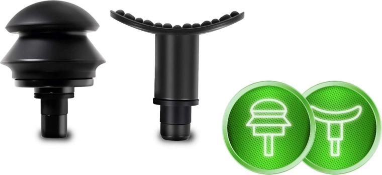 I pakken finder du 6 udskiftelige hoveder: kuglehoved til større muskelgrupper, U‑gaffel omkring rygsøjle og sener, fladt hoved med knopper til bredere stimulering, “projektil” til præcist dybdetryk, blød “svamp” til følsomme områder samt et buet hoved med knopper ideelt til fødder og lægge. Alle hoveder undtagen kuglehovedet kan bruges med massageolie (sørg for, at olie ikke trænger ind i enheden eller på fastgørelsesdelen).