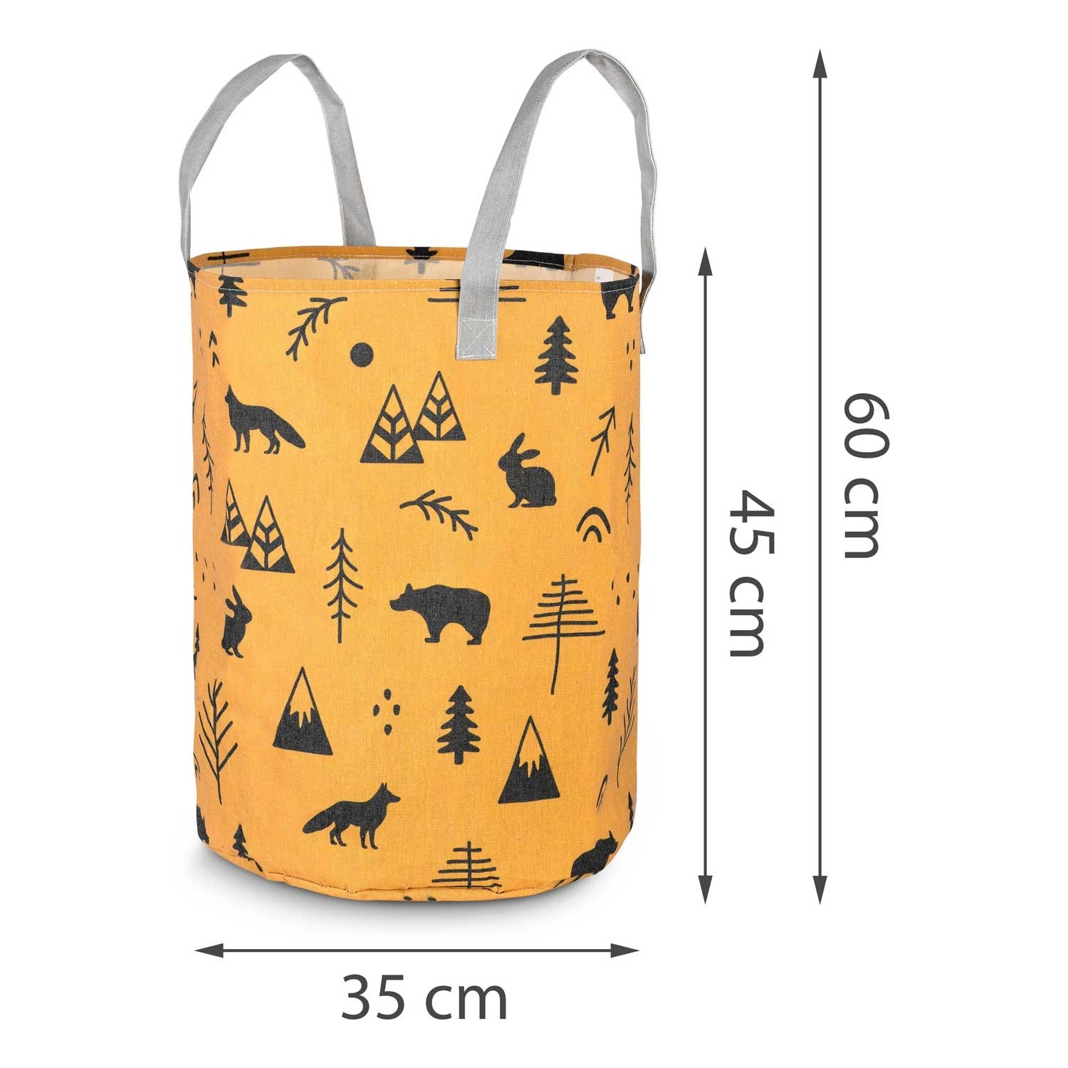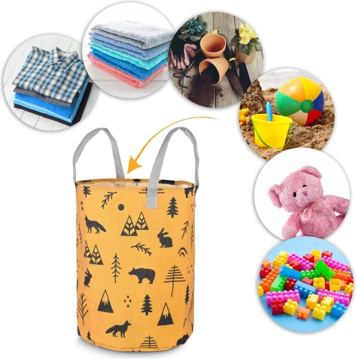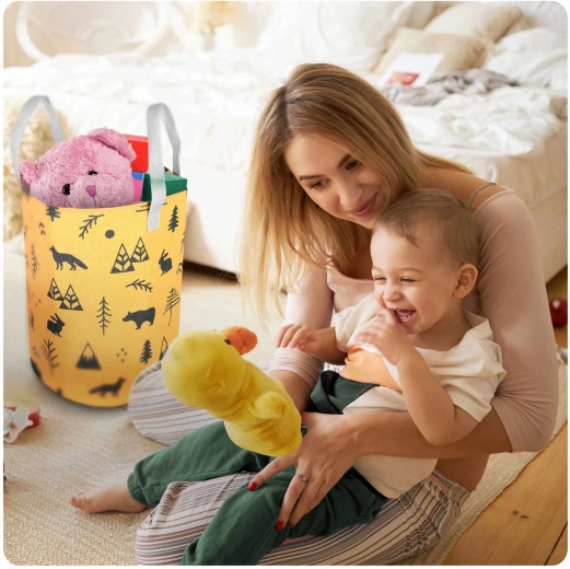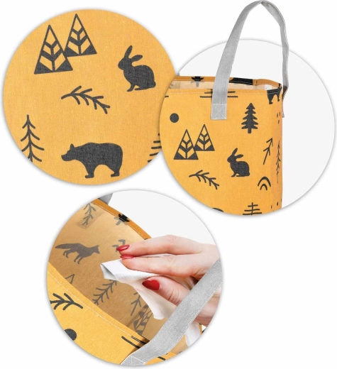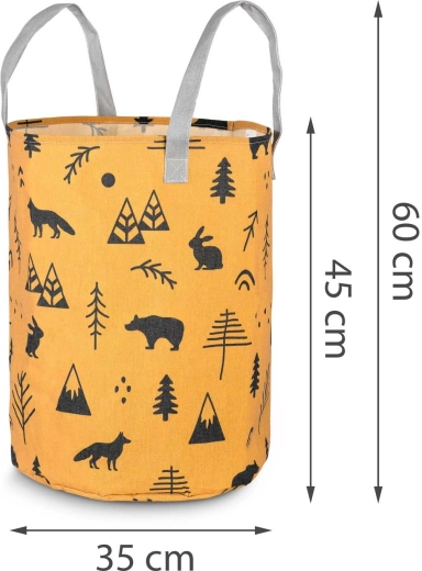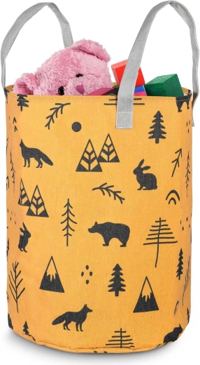 Gør oprydning sjov. Den tekstile NUKIDO-legetøjskurv med gult print af skovmotiver er designet til at være funktionel, holdbar og æstetisk. Takket være den høje cylindriske form og åbne top kan du nemt lægge bamser, klodser og småting i – og hurtigt finde dem igen.