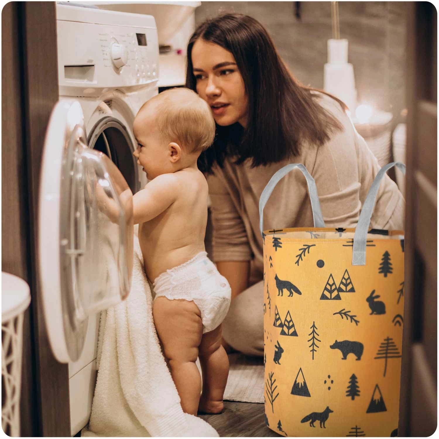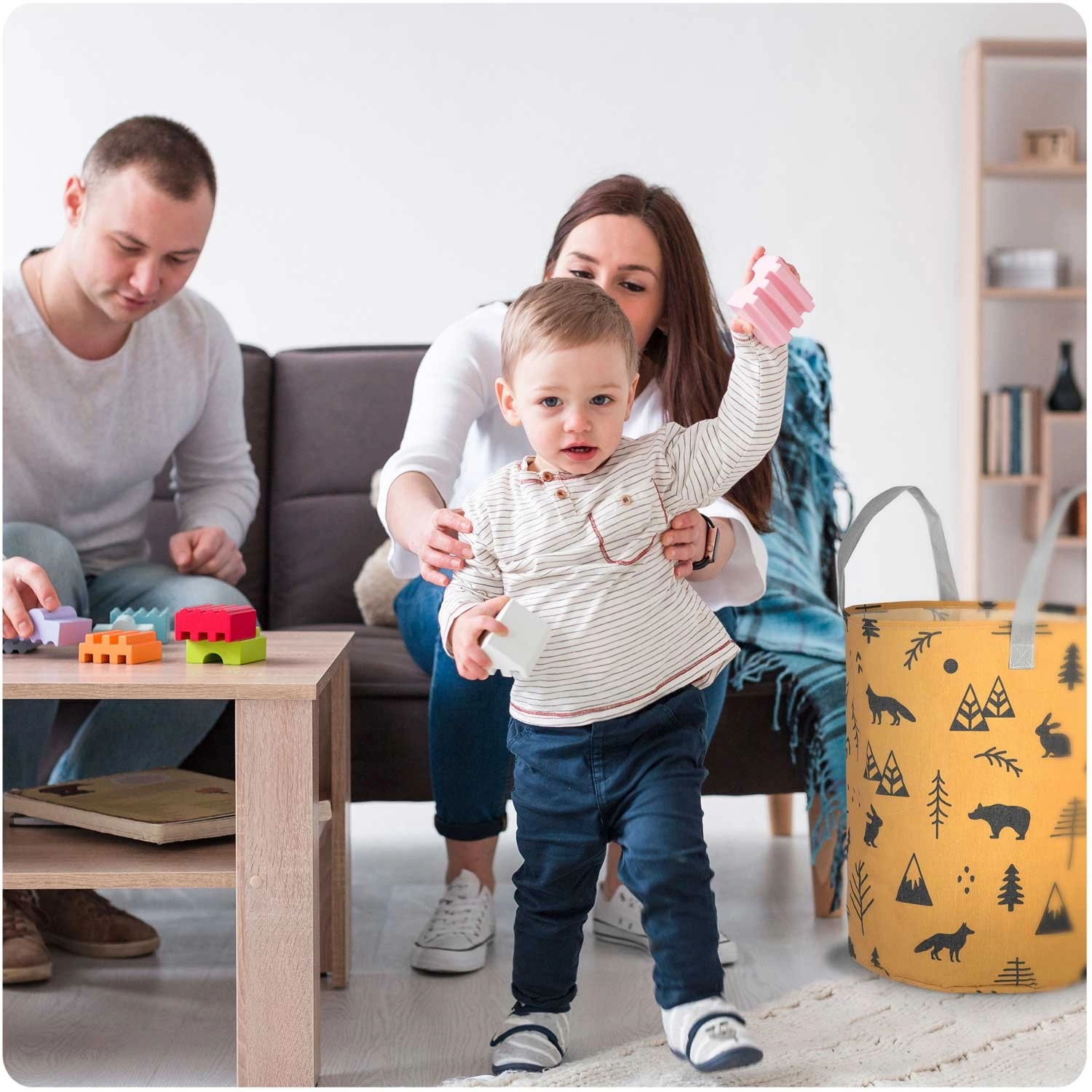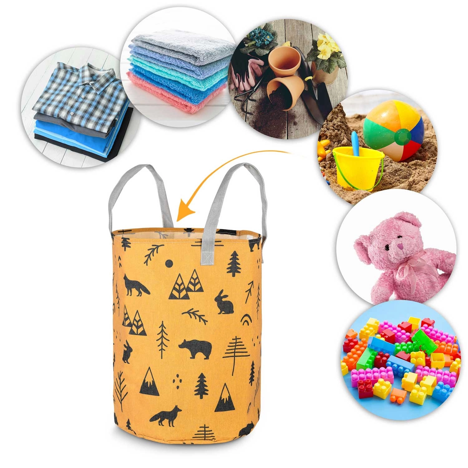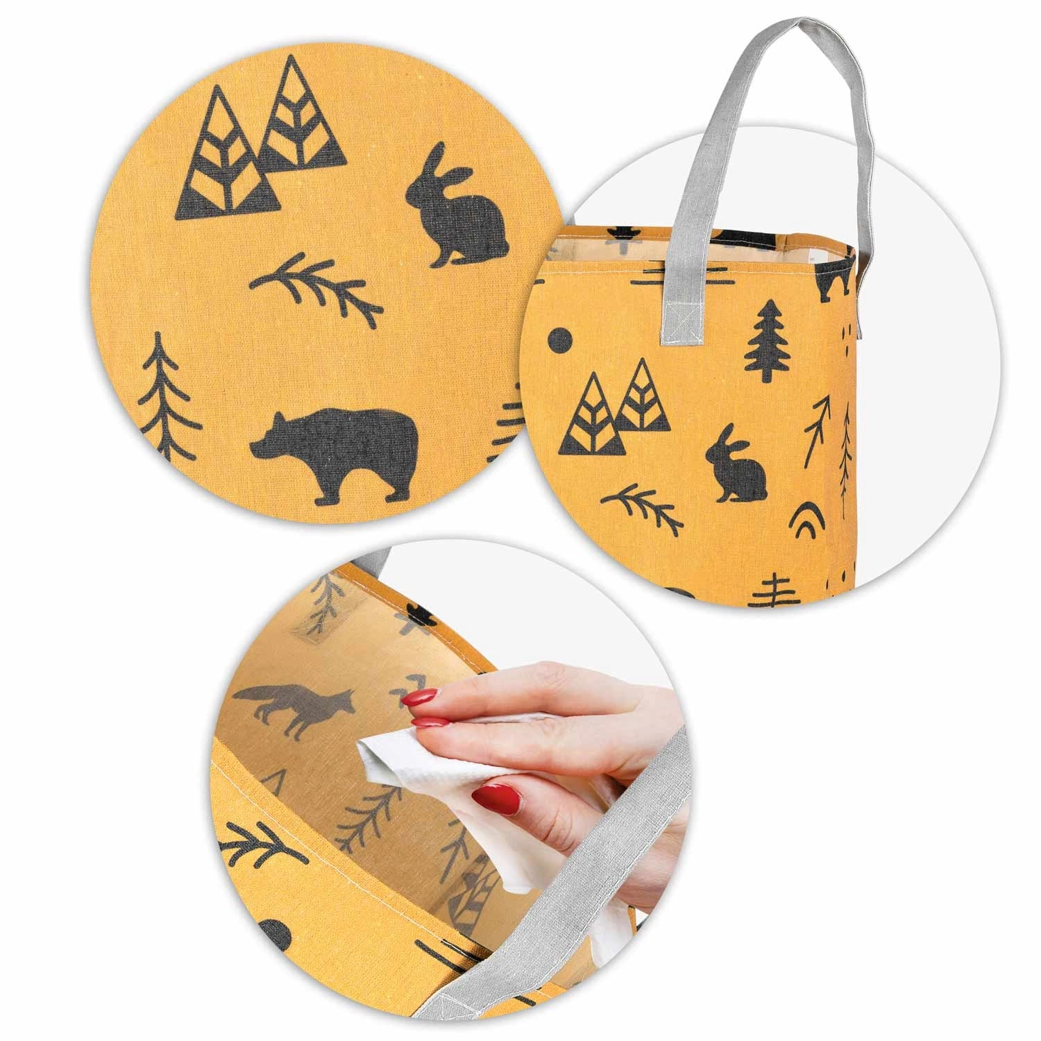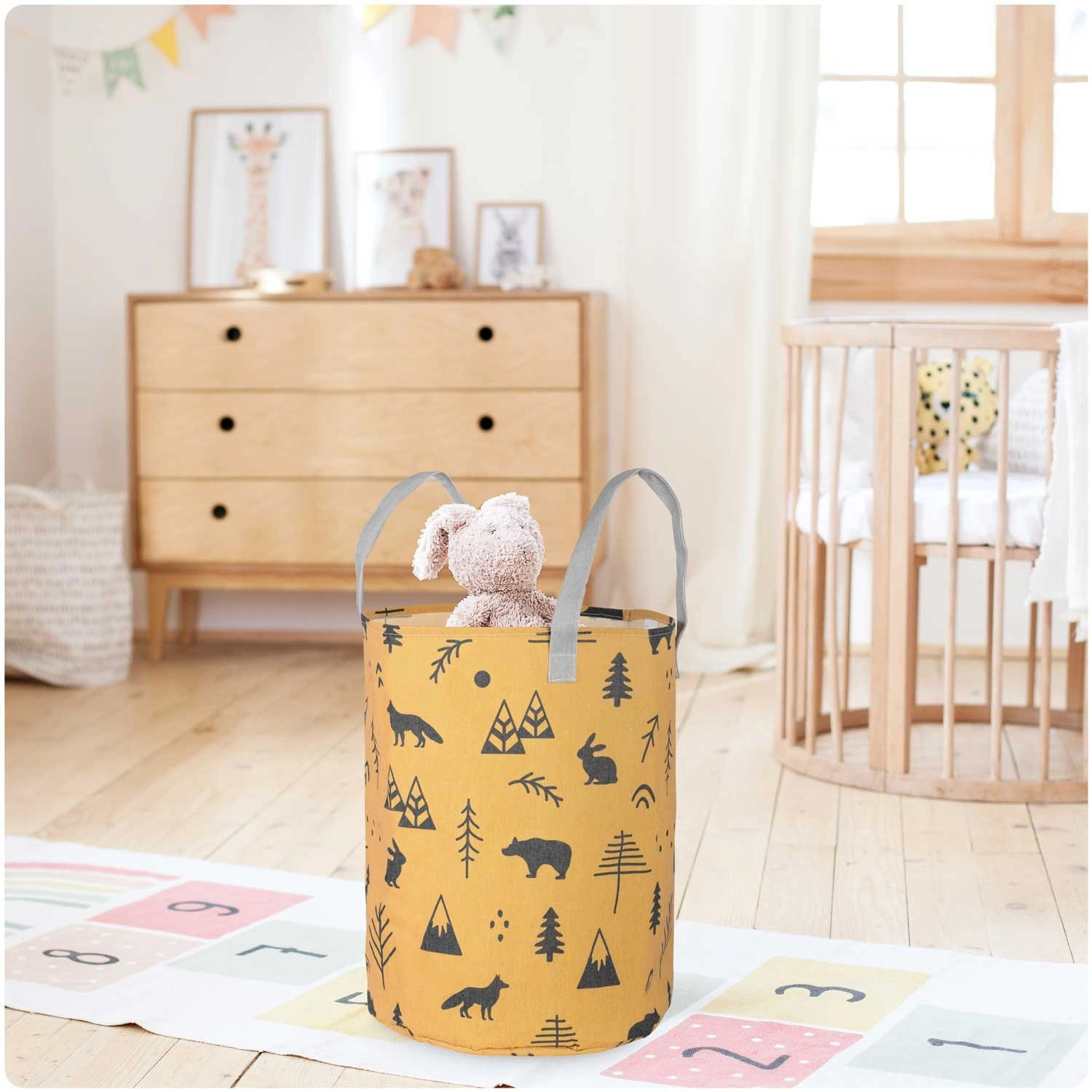 Kurven er let og bærbar takket være de stærke håndtag, men den holder formen og står selvstændigt. Den passer til børneværelse, badeværelse og stue – brug den til legetøj, vasketøj, tæpper eller tilbehør. Overfladen er let at vedligeholde, og printet giver rummet et hyggeligt, legende udtryk.
