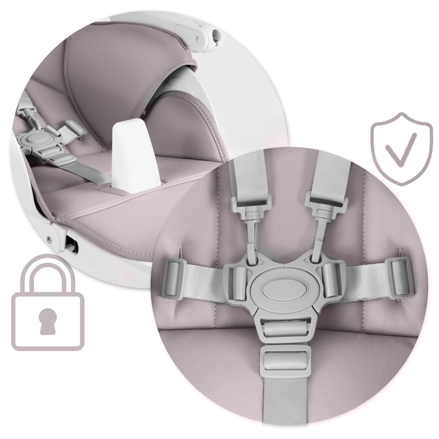 - Sikkerhed: 5-punkts seler, robust ramme, europæisk standard EN 14988.