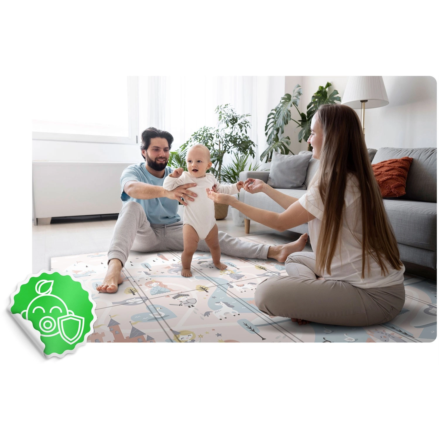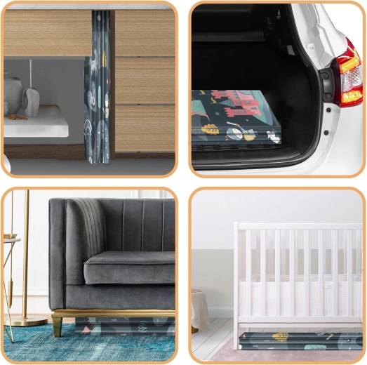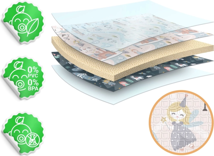 Måtten foldes hurtigt som en harmonika, er nem at bære og kan opbevares under sengen eller i bilen. Den vandafvisende overflade skal blot tørres af med en fugtig klud, hvilket er praktisk derhjemme, på besøg eller udendørs på picnic. Materialet er fri for BPA/PVC/ftalater/formamid, opfylder CE og testene EN71-1/2/3, så du kan regne med dokumenteret kvalitet og sikkerhed.