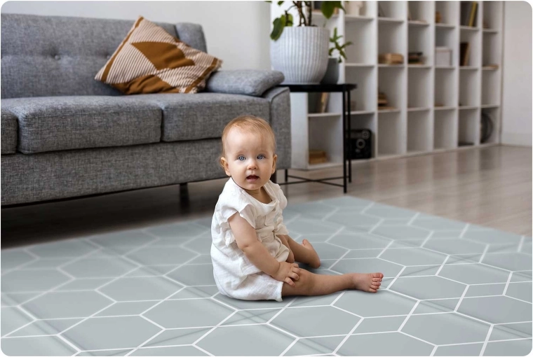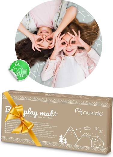 Det stilfulde og sikre NUKIDO-tæppe vokser med dit barn – fra de første forsøg på at rulle og kravle til kreativ leg, træning og spil. Med det dobbeltsidede design matcher du let indretningen: på den ene side et subtilt geometrisk mønster, på den anden en legesyg ocean-inspiration. Det robuste XPE-skum på 1 cm dæmper stød effektivt og giver termisk isolering mod kolde gulve.