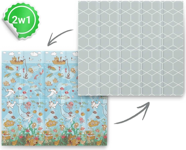 Den store sammenklappelige legetæppe NUKIDO 200 × 180 × 1 cm tilbyder to designsider (ocean og geometrisk mønster), stødabsorbering takket være 1 cm XPE-skum og nem vedligeholdelse. Den er vandafvisende, skridsikker, fri for BPA, PVC, ftalater og formamid og opfylder europæiske sikkerhedsstandarder inklusive CE og EN71.