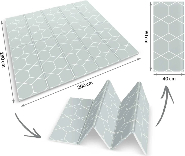Måtten foldes på et øjeblik, er let at bære, og takket være den vandafvisende overflade kan den nemt rengøres med en fugtig klud.