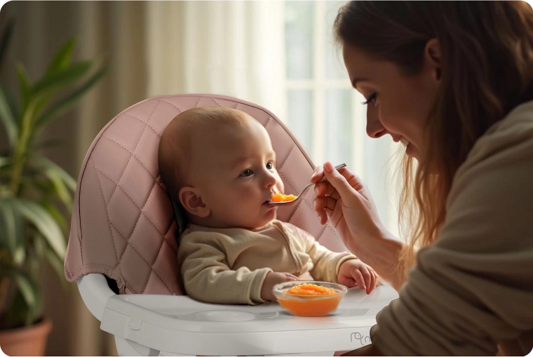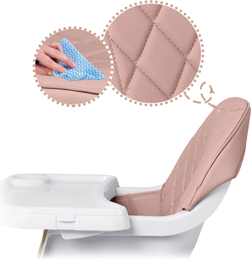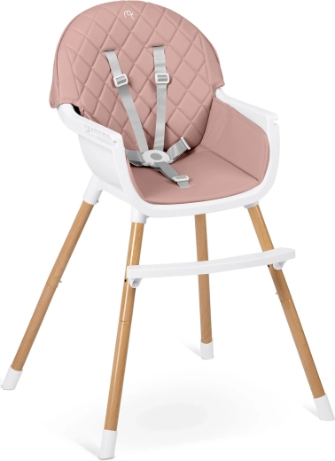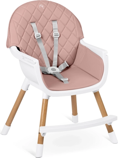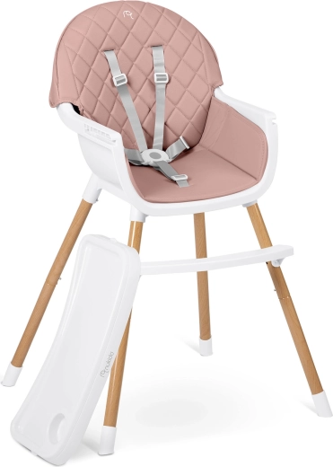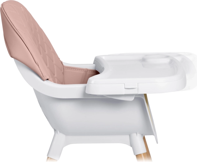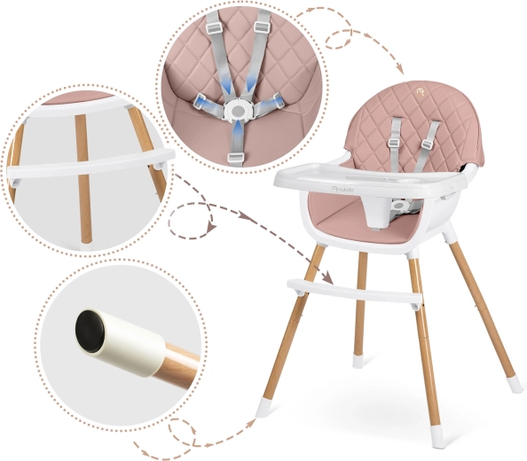 Sikkerheden sikres af 5-punkts seler, stabile stålben med trædekoration og skridsikre ender. Højstolen opfylder den strenge europæiske standard EN 14988. Den er ideel ikke kun til fodring, men også til leg, tegning og læsning – barnet sidder behageligt og i korrekt position.