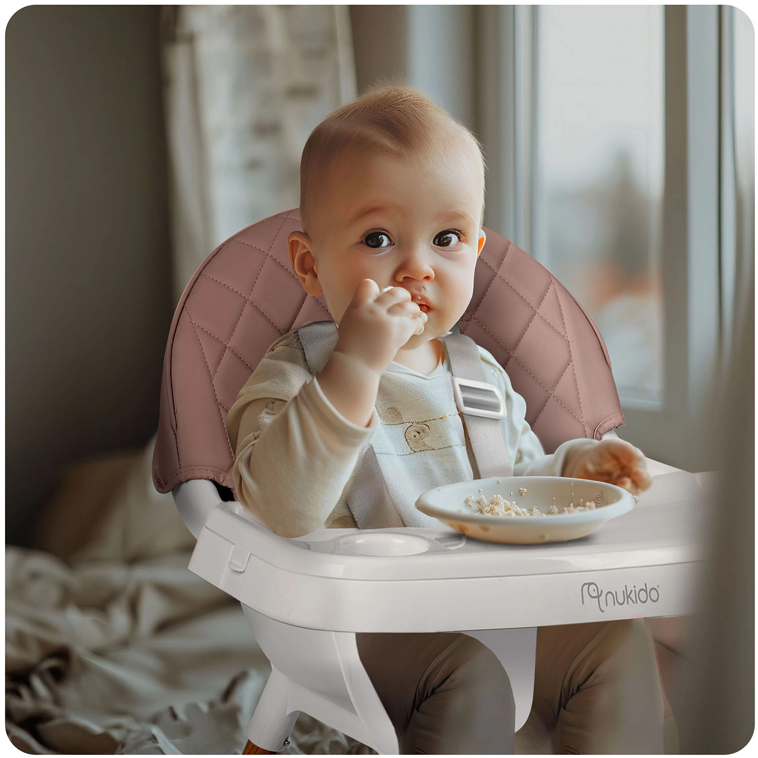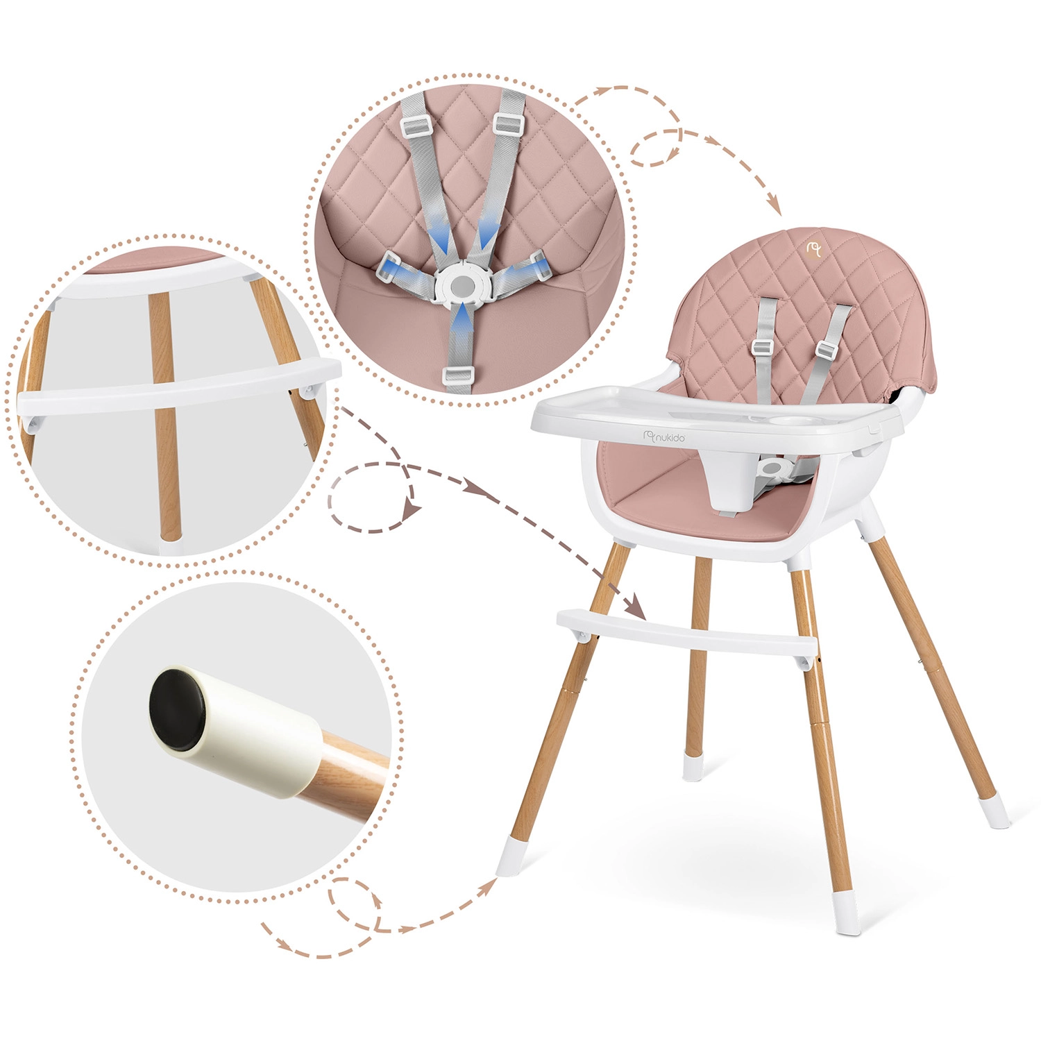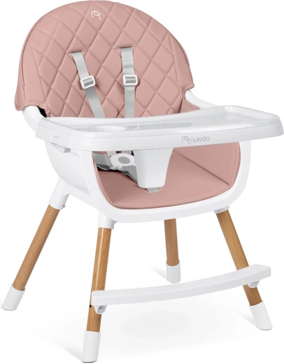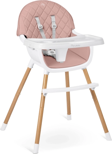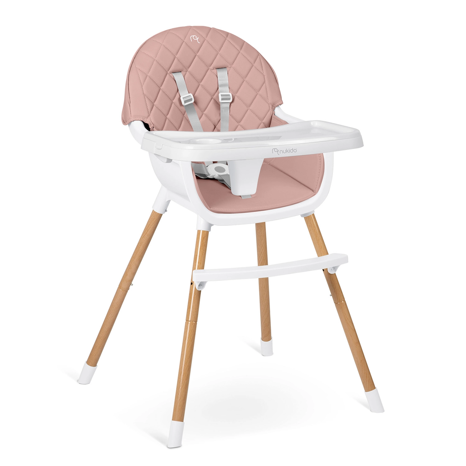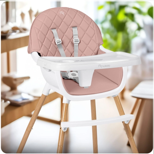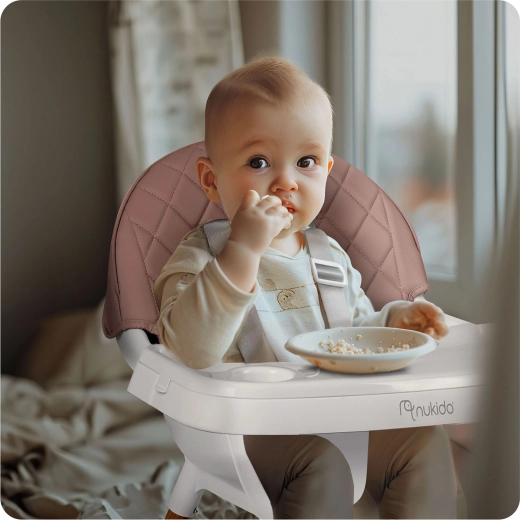 NUKIDO Lilo er en praktisk højstol, der vokser med dit barn. Takket være to niveauer af bakkejustering tilpasser du nemt pladsen foran barnet, og bakken kan desuden fjernes helt for selvstændig siddestilling ved bordet. Det bløde, polstrede sæde i et materiale, der ikke absorberer snavs, tørres blot af efter måltidet.