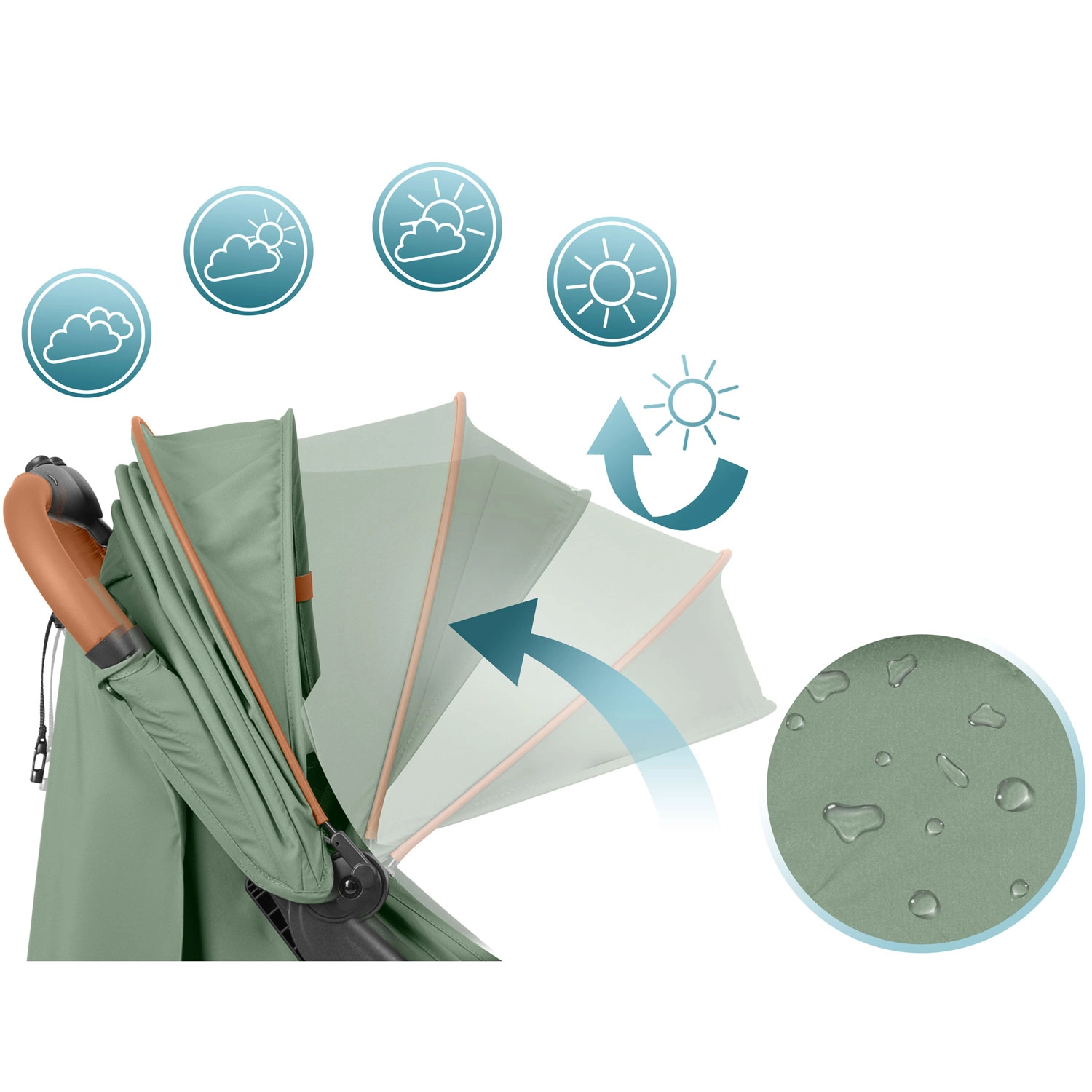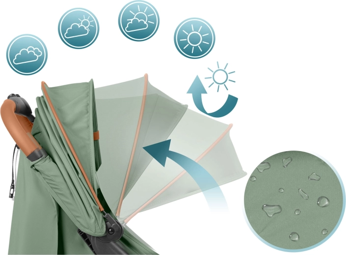 Udvidelig canopy med flere positioner beskytter mod sol, vind og let regn. Vandafvisende materiale og variabel skygge til både lur og nysgerrig udsigt.