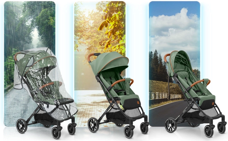 - Alt slags vejr: vandafvisende tekstiler, udvidelig kaleche, regnslag inkluderet.