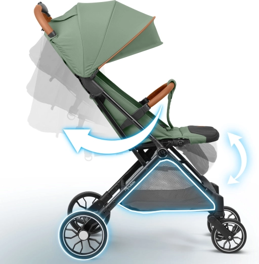 For forældre er der lynhurtig one-hand-fold til håndbagagestørrelse, en praktisk opbevaringskurv under sædet og en central bremse på baghjulene. Det justerbare ryglæn næsten helt ned i flad liggestilling samt justerbar fodstøtte giver komfort både under søvn og når verden skal udforskes.