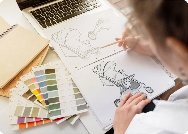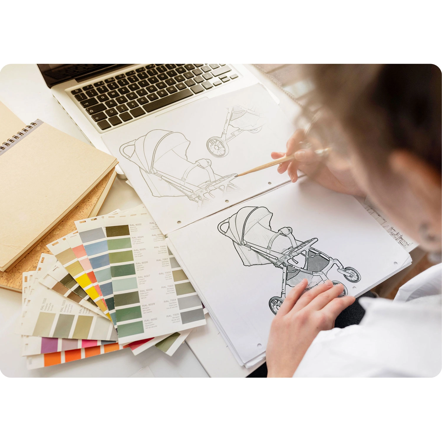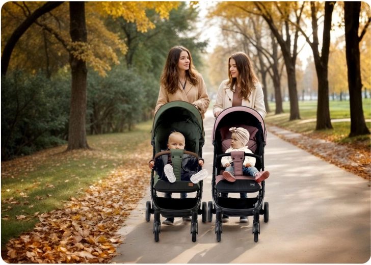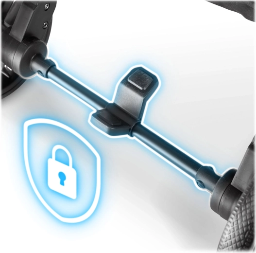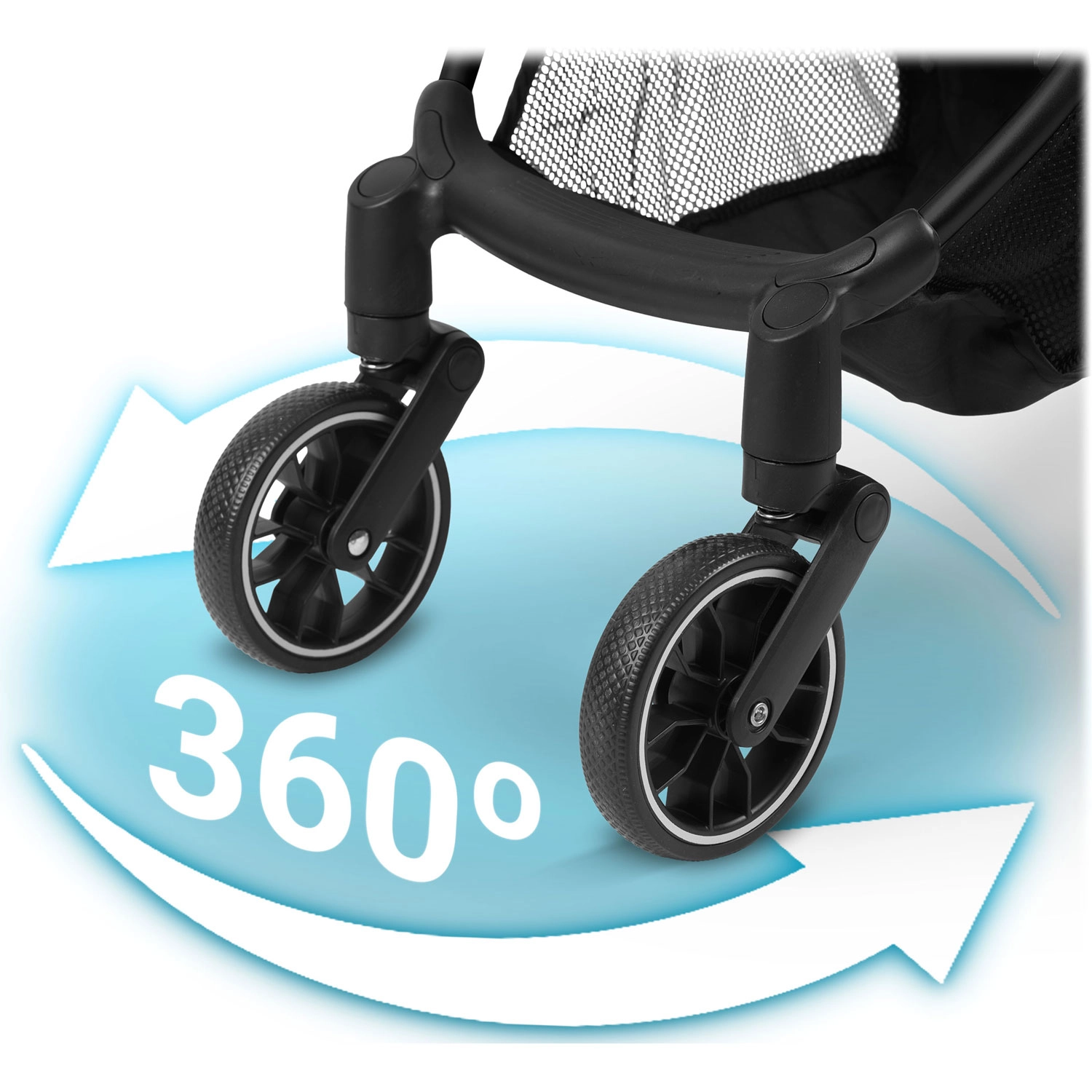 Drejelige forhjul med stabil dæmpning og store baghjul klarer ujævnheder og skarpe sving. Bedre manøvredygtighed, færre rystelser, mere komfort for barnet.