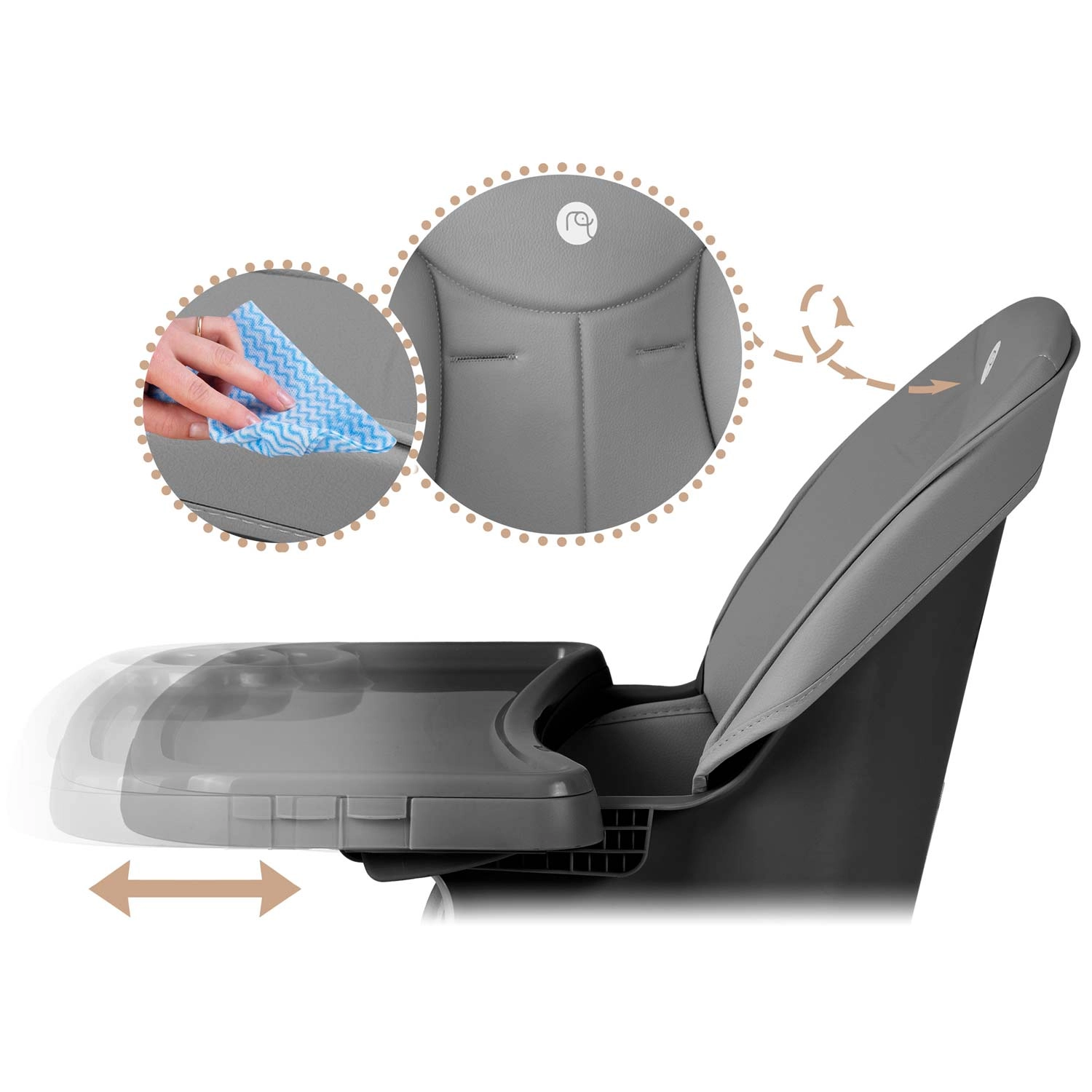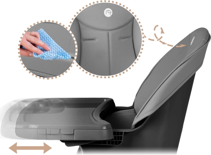 Hovedbordet er skydbart og fuldt aftageligt – med praktisk indsats og forhøjede kanter mod spild. Overfladerne kan nemt tørres af med en fugtig klud, mens bord og indsats kan tåle opvaskemaskine. For maksimal sikkerhed er der 5-punkts sele og solid fodstøtte. Højstolen opfylder den strenge europæiske standard EN 14988.