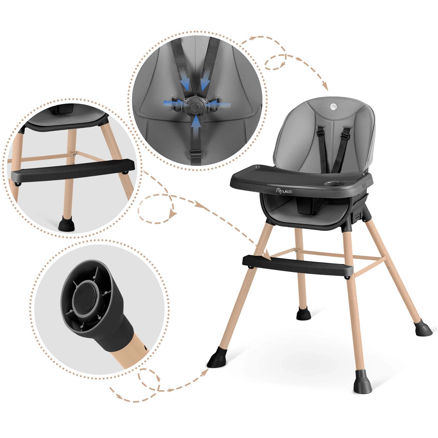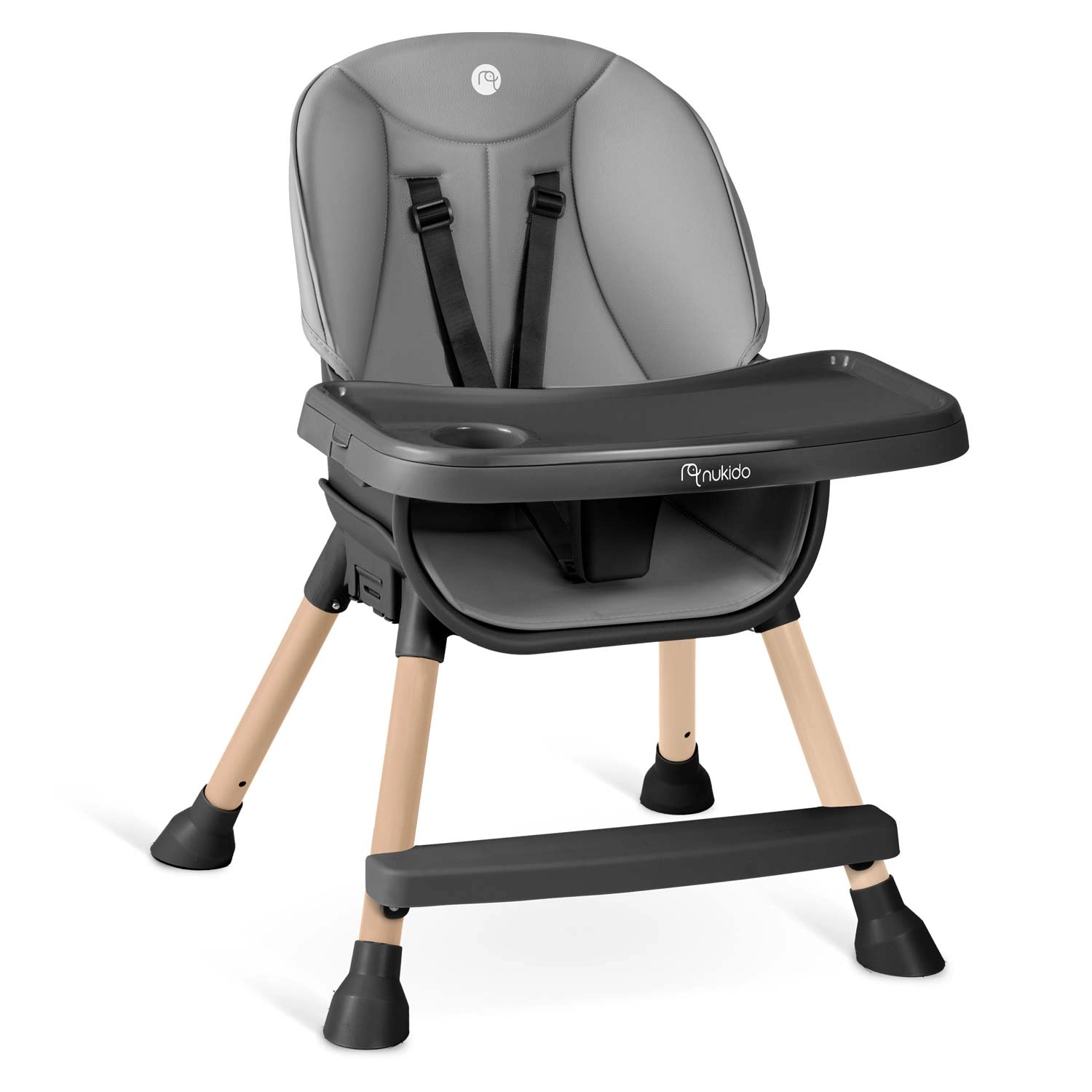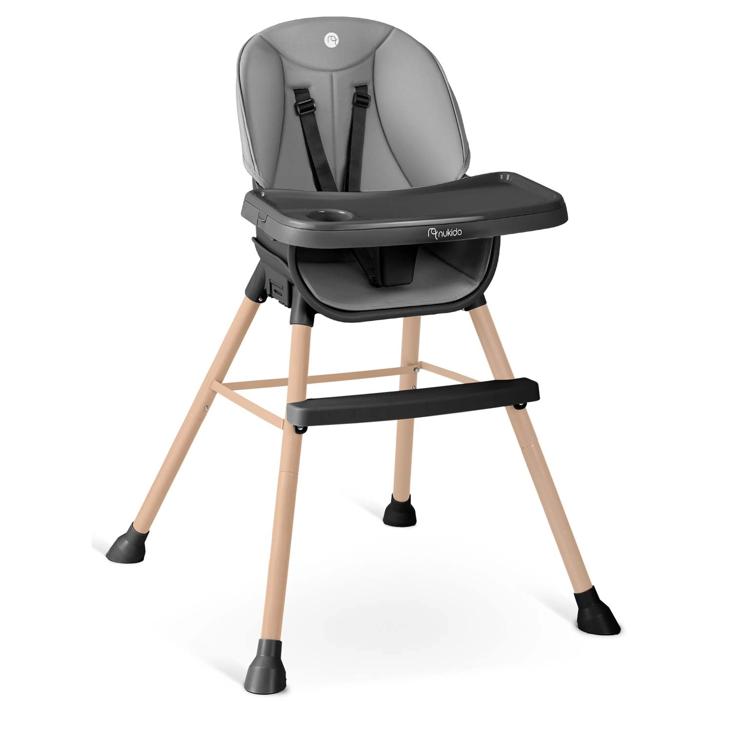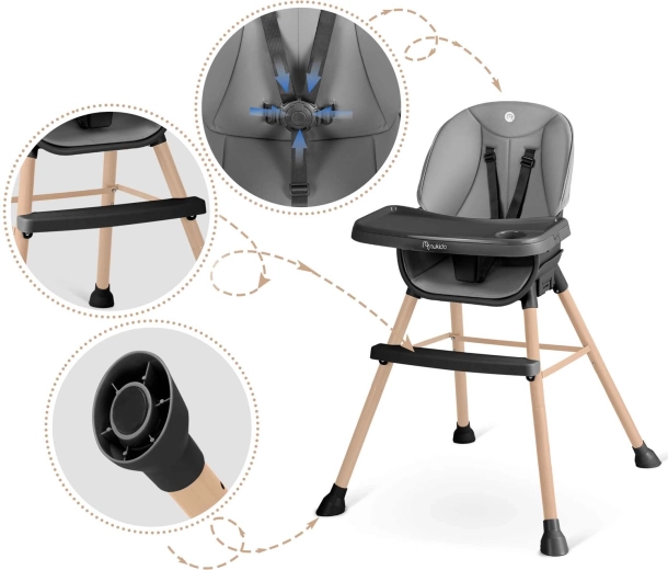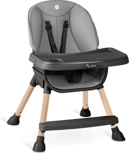 Praktisk og stilfuld børnehøjstol NUKIDO Tilo 3-i-1 vokser med dit barn – fra de første smagsprøver til selvstændige måltider og leg. Den tilbyder et justerbart og aftageligt bord med forhøjede kanter og indsats, let aftørringsvenlige materialer, 5-punkts sikkerhedssele og stabile ben med skridsikre fødder. Ideel til fodring, tegning og læsning – sikkert, bekvemt og rent på et øjeblik.