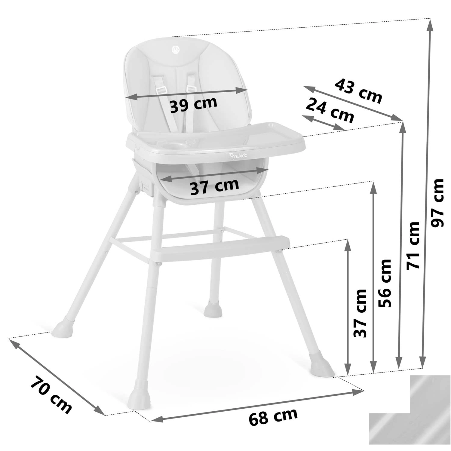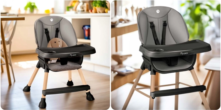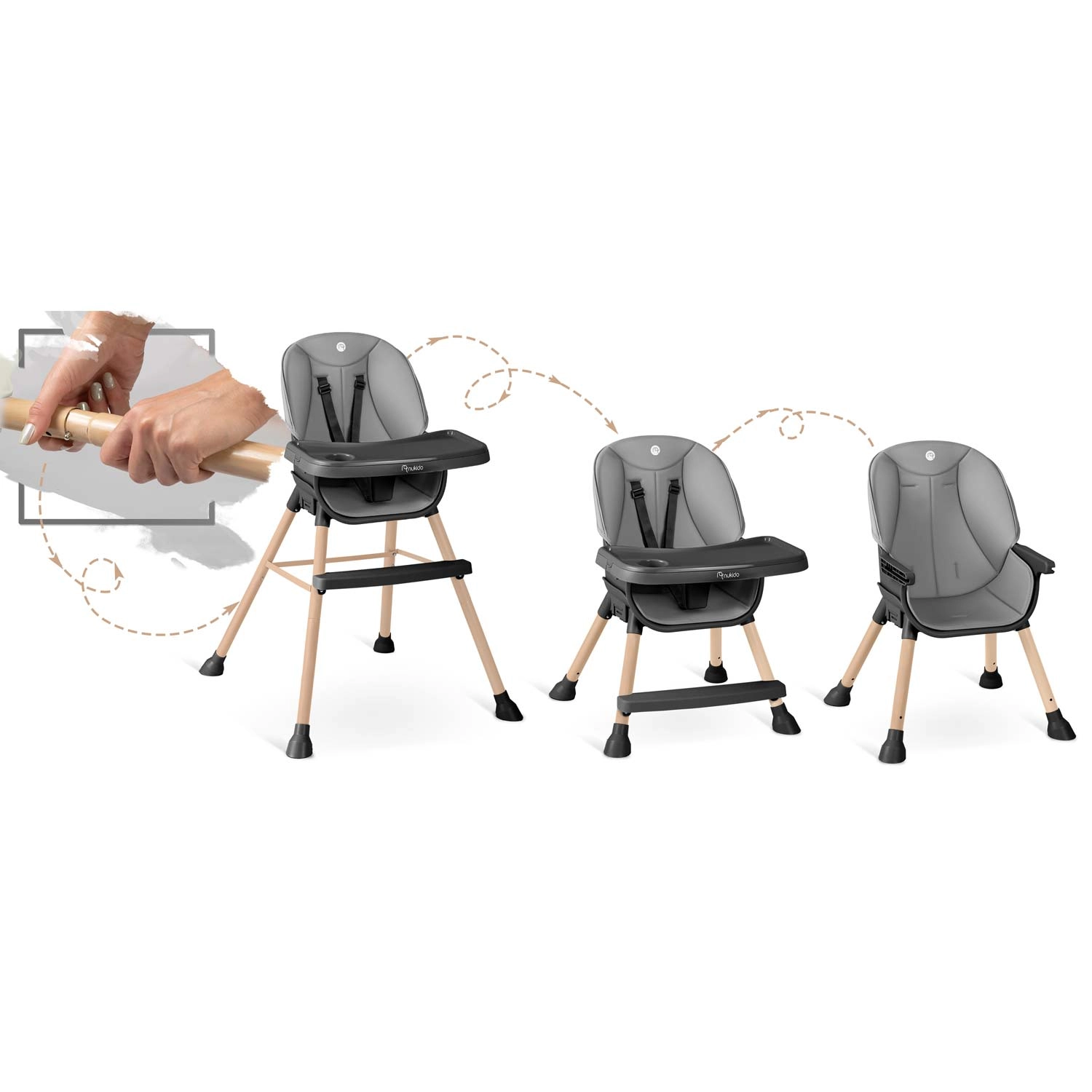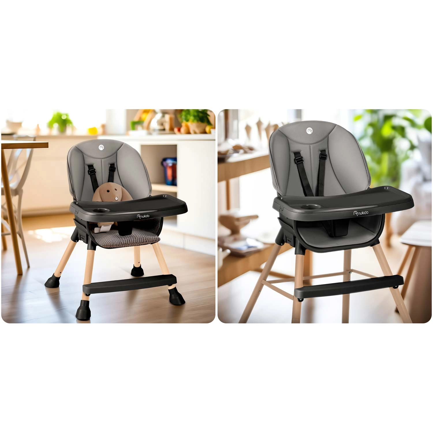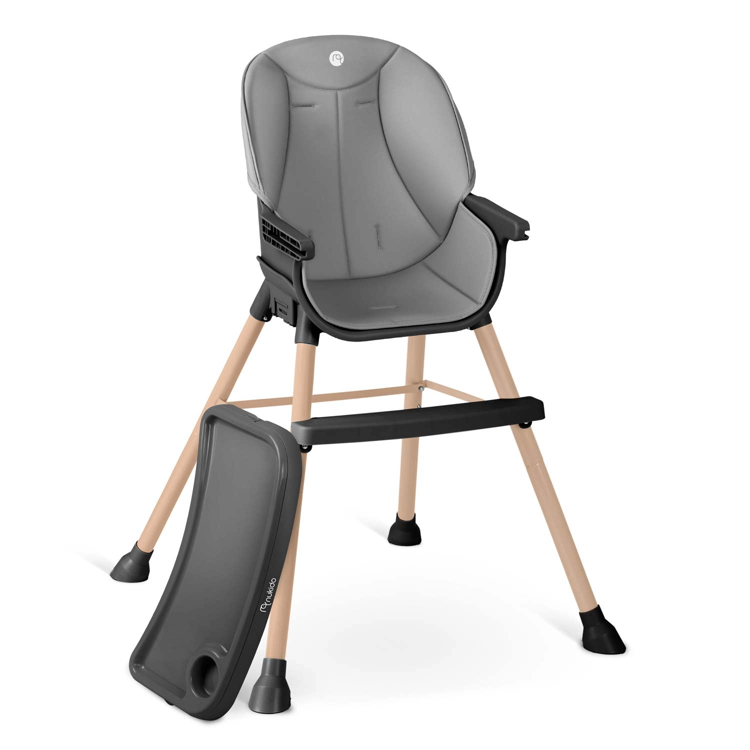 Praktisk og stilfuld børnehøjstol NUKIDO Tilo 3-i-1 vokser med dit barn – fra de første smagsprøver til selvstændige måltider og leg. Den tilbyder et justerbart og aftageligt bord med forhøjede kanter og indsats, let aftørringsvenlige materialer, 5-punkts sikkerhedssele og stabile ben med skridsikre fødder. Ideel til fodring, tegning og læsning – sikkert, bekvemt og rent på et øjeblik.