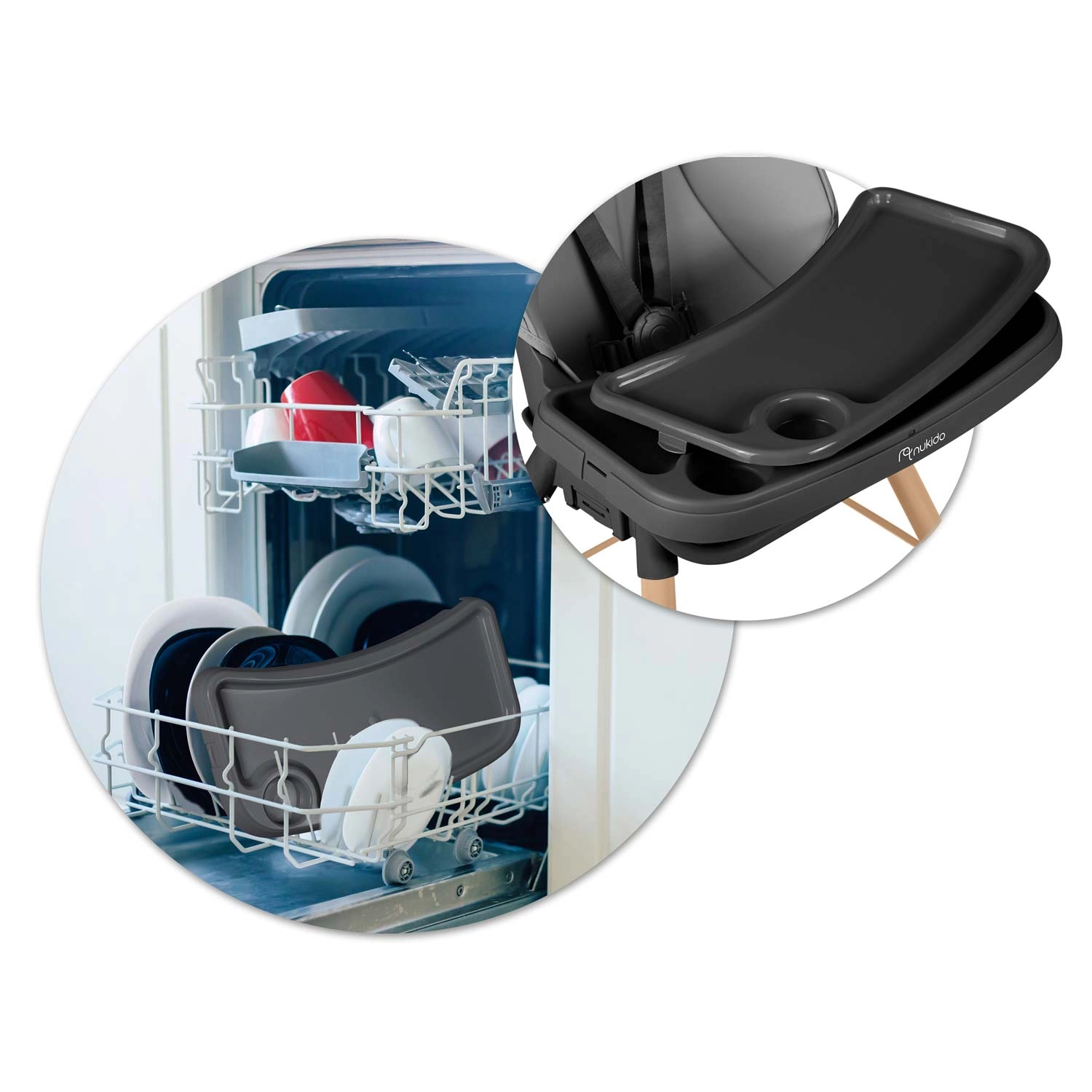 Bordet med forhøjede kanter og separat indsats kan nemt klikkes af og skylles under vand eller vaskes i opvaskemaskinen. Glatte overflader kræver blot en aftørring med en klud.