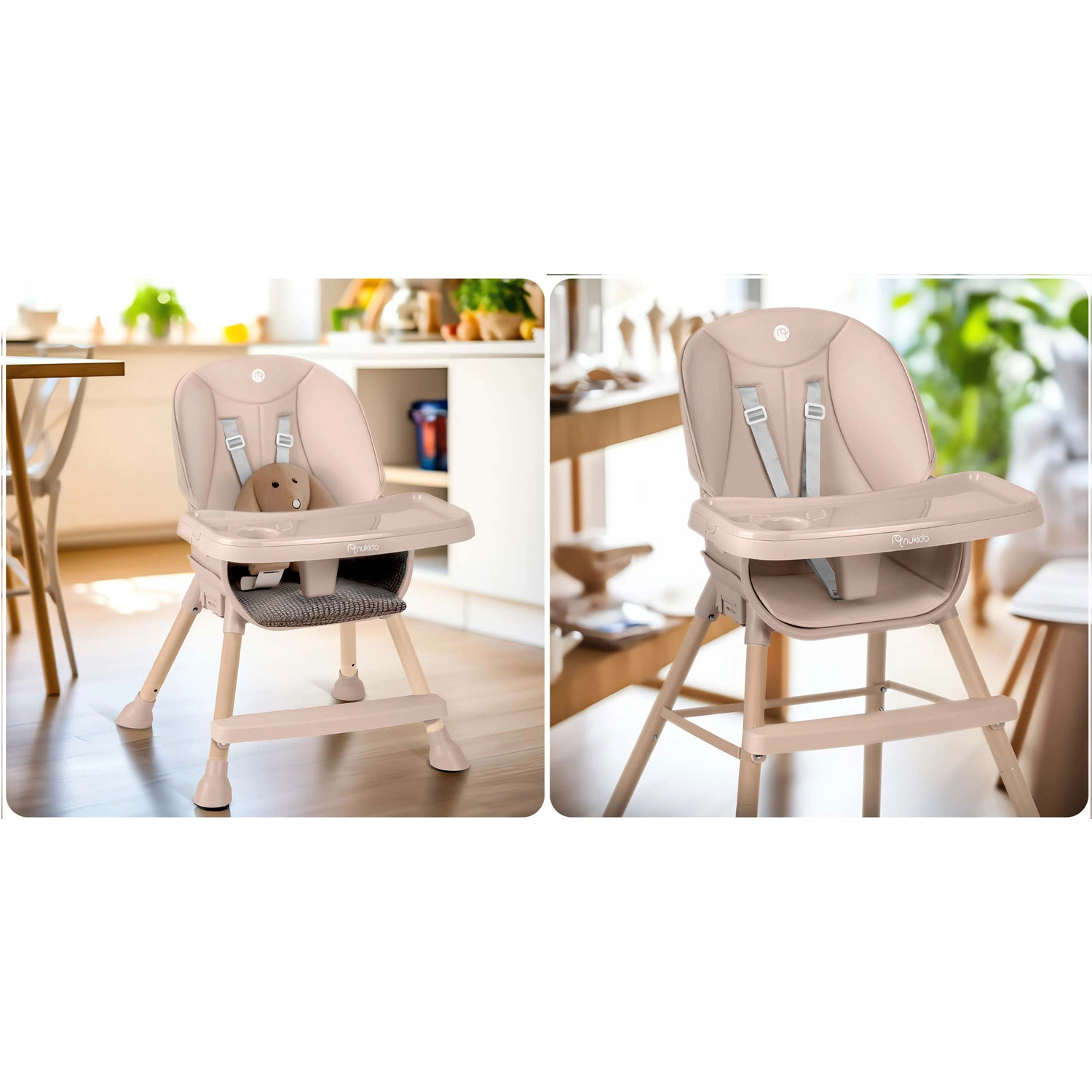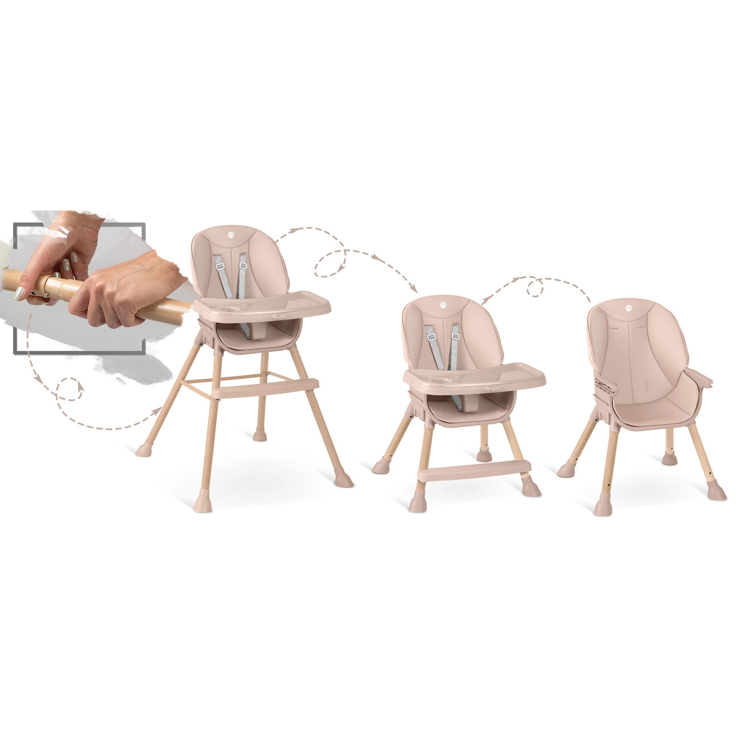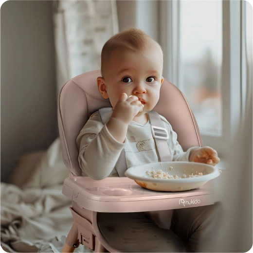 Én stol, tre anvendelser. Tilpas NUKIDO Tilo til barnets alder og aktiviteter – fra fodring til leg ved bordet.
