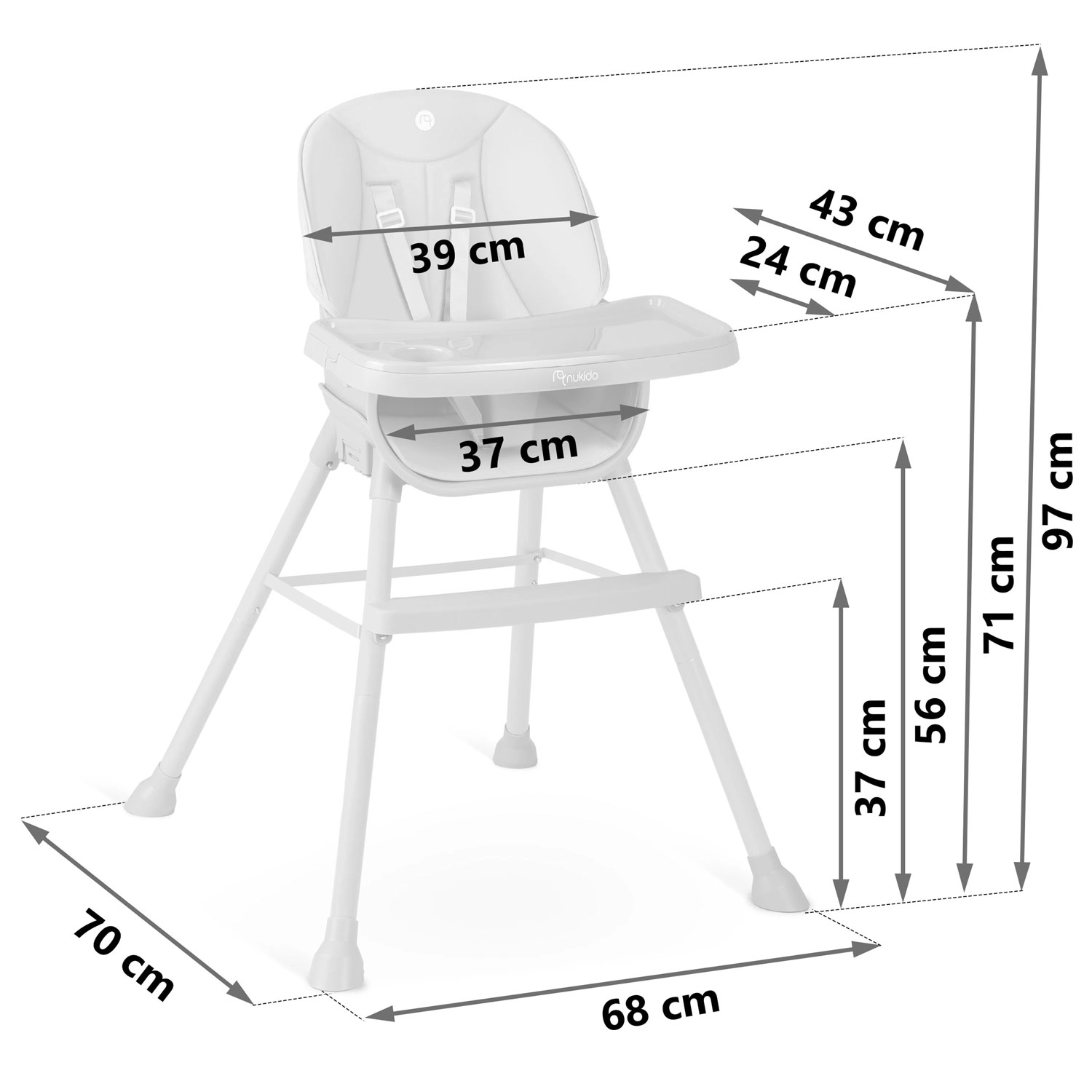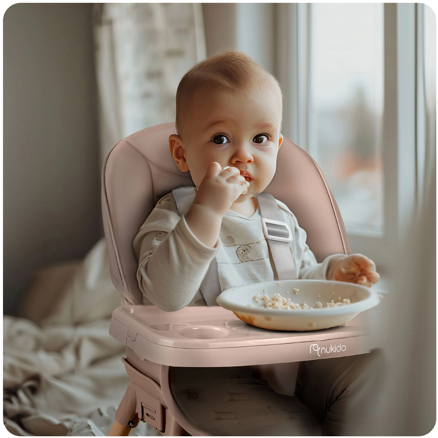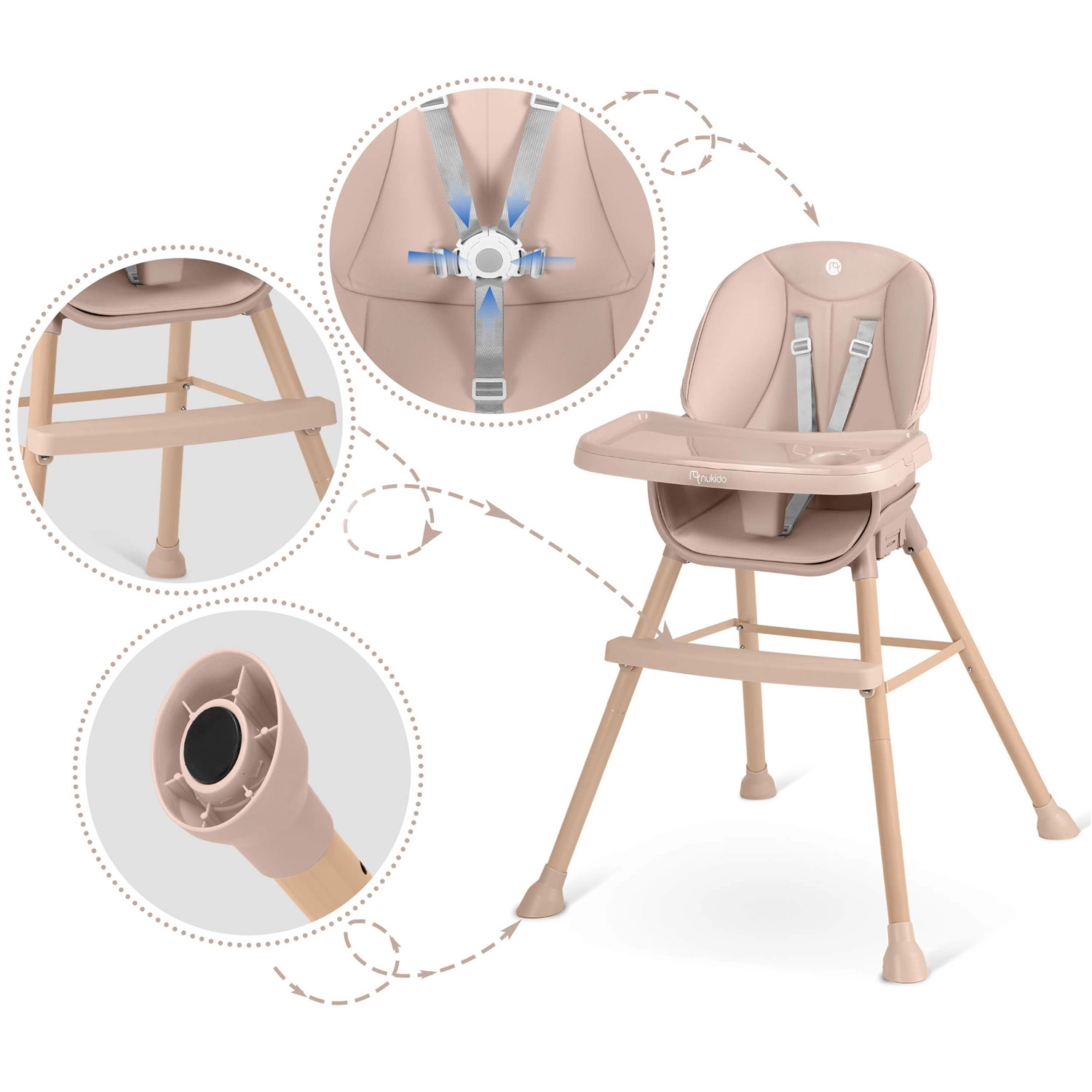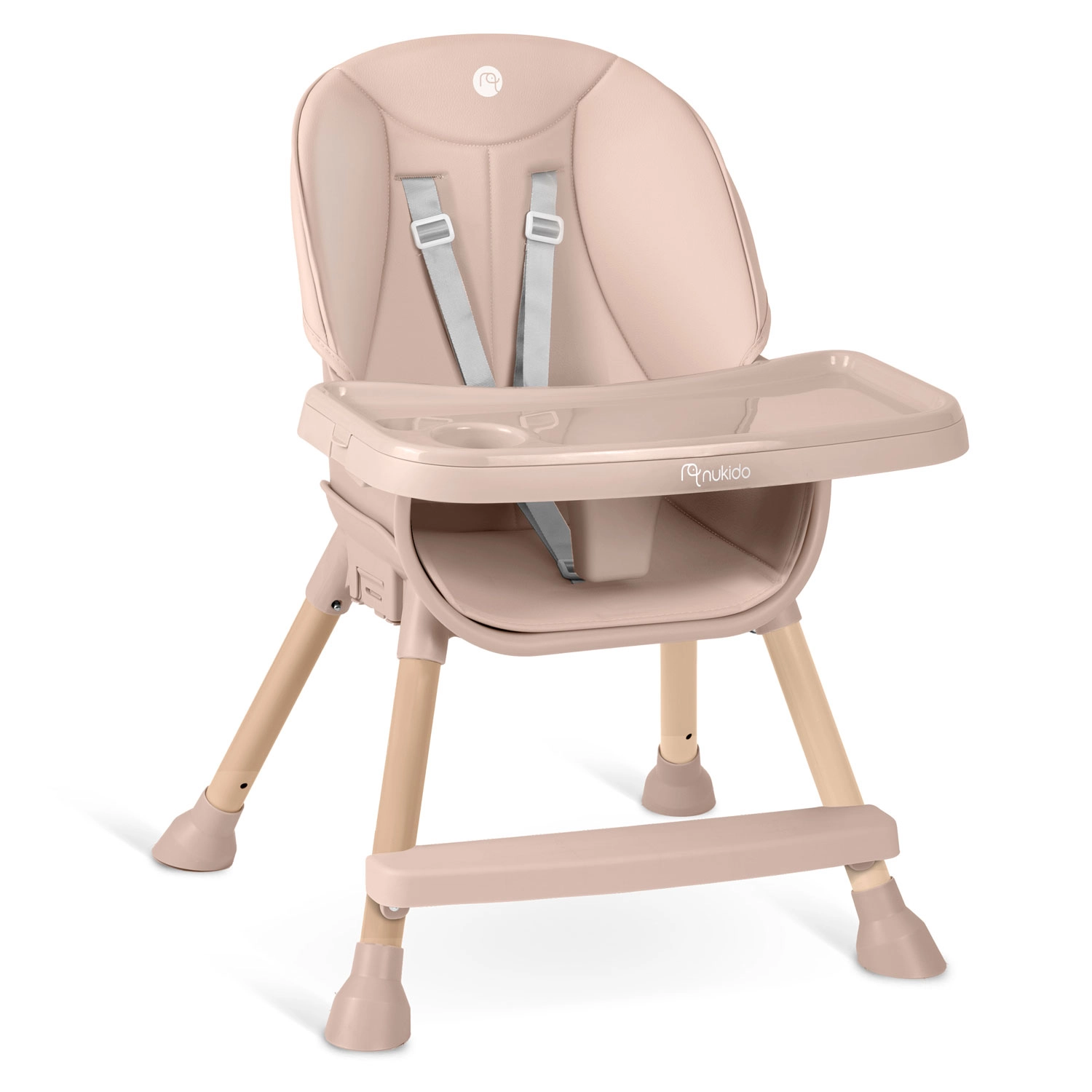 NUKIDO Tilo er en alsidig børnehøjstol 3-i-1, som nemt kan omdannes fra høj spisestol til lav stol til tumling eller til et selvstændigt sæde. Med trinløs justering af bakkens afstand og hurtigafmonterbar indsats holder du orden på ingen tid – løft indsatsen af og skyl den eller sæt den i opvaskemaskinen.