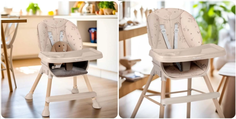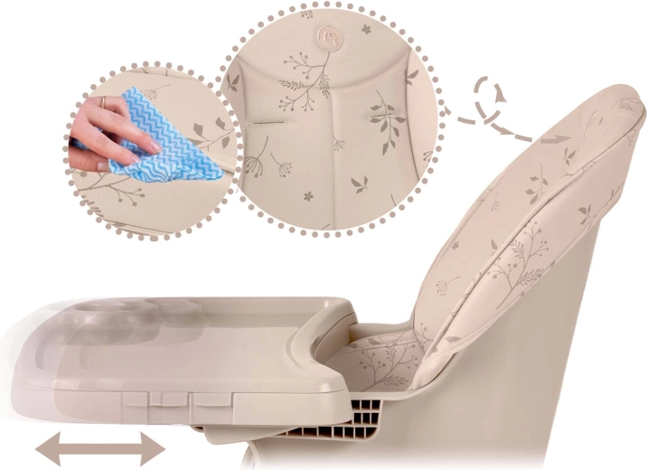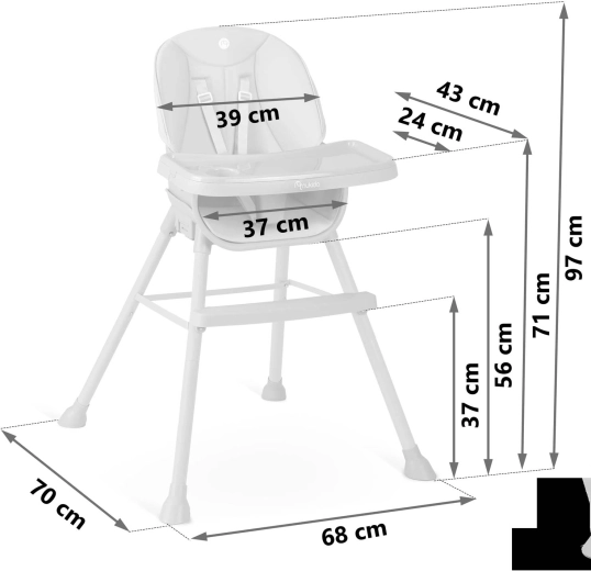 Sikkerheden sikres af 5-punkts seler, en bred base med skridsikre fødder og en solid fodstøtte for korrekt støtte til benene. Konstruktionen er stabil og holdbar og opfylder den strenge standard EN 14988. Højstolen er ideel ikke kun til fodring, men også til at tegne, bygge klodser eller de første læseeventyr – den praktiske bakke holder bøger, skål og kop inden for rækkevidde.
