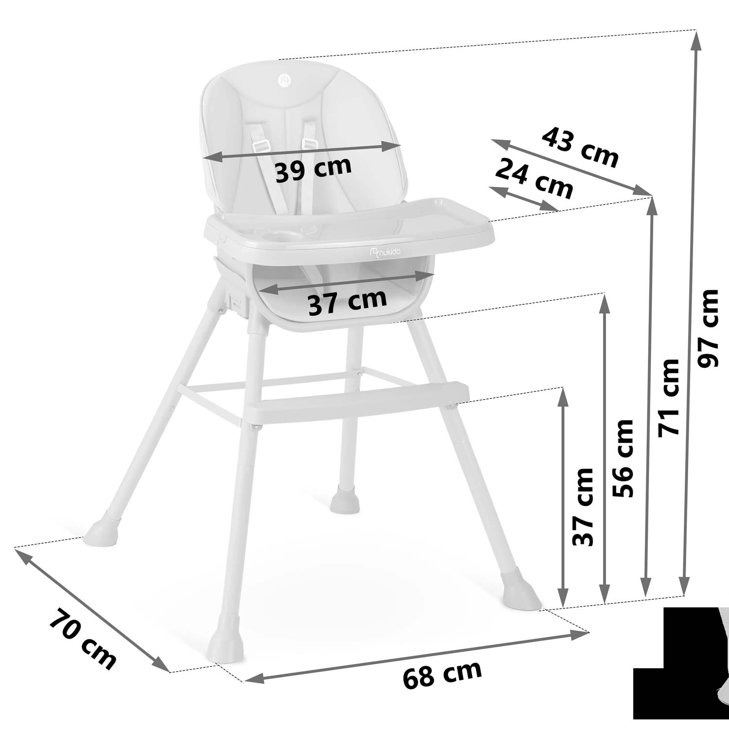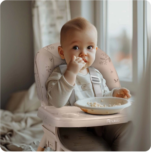 NUKIDO Tilo er en gennemtænkt børnehøjstol, der tilpasser sig alle vækstfaser. Takket være det smarte 3-i-1-system fungerer den som høj højstol, sædeforhøjer med bakke eller lav stol til tumlinger. Justerbar afstand på bakken og en aftagelig øvre indsats med forhøjede kanter gør både servering og oprydning nemmere. Det blødt polstrede betræk i materiale, der ikke absorberer snavs, skal blot aftørres efter måltidet.