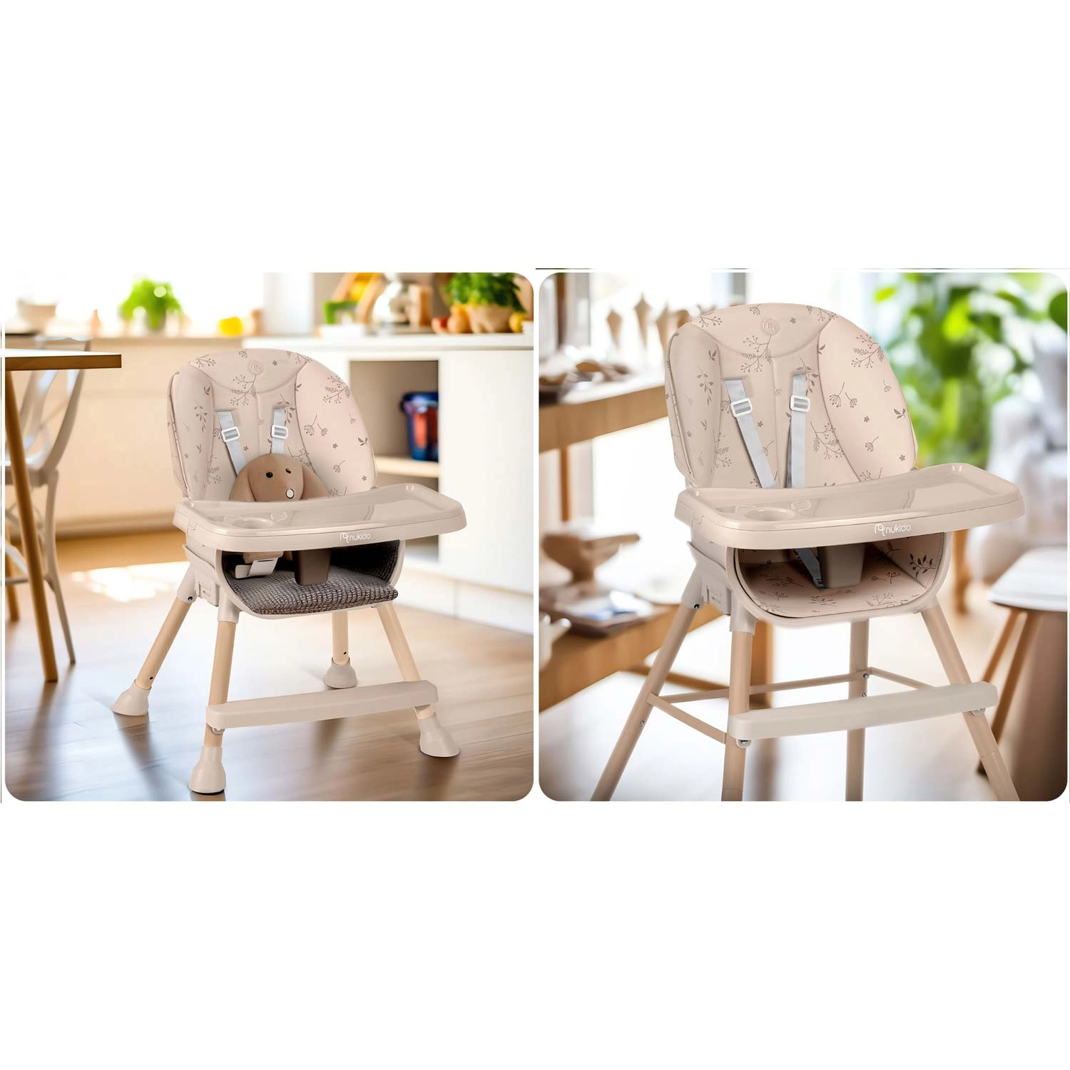 NUKIDO Tilo kan nemt ombygges fra en høj højstol til en sædeforhøjer med bakke eller en lav stol til tumlinger. Én stol til spisning, leg og læsning.