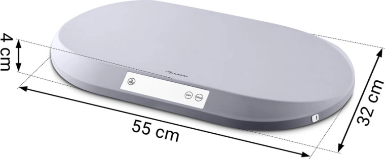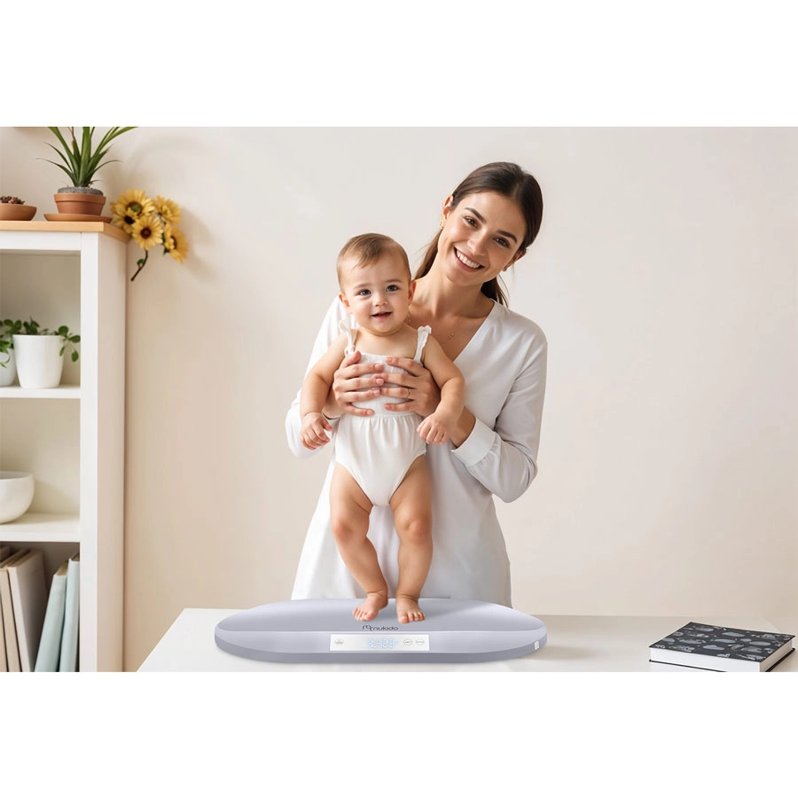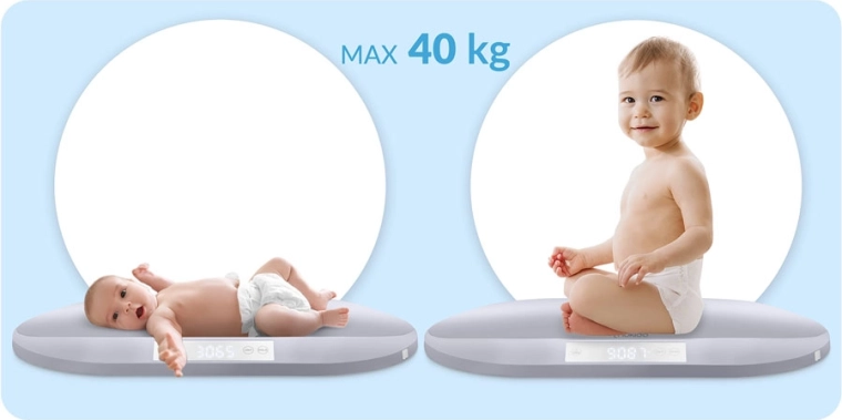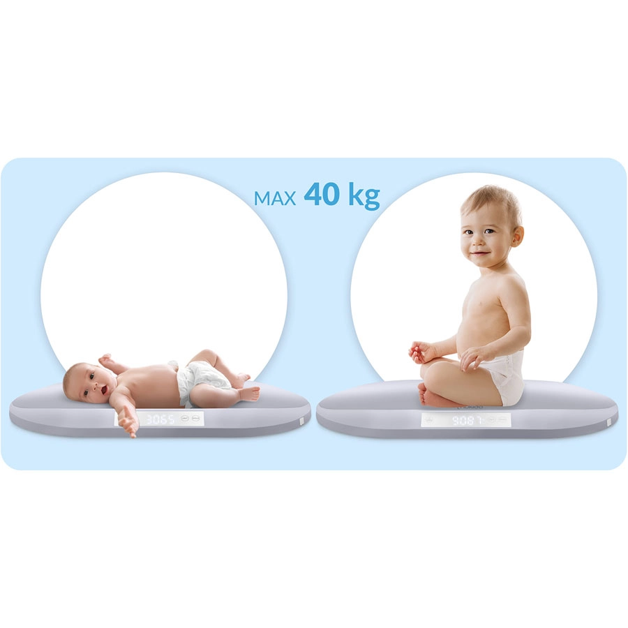 Takket være maksimal bærekapacitet på 40 kg kan vægten følge dit barn i mange år og understøtte vægtkontrol fra spæd til skolealder. Stort, letlæseligt LCD-display, ergonomisk formet vejeflade og valgbare enheder (g, kg, oz, lb) gør hver vejning nemmere. Inkluderer også målebånd op til 150 cm til hovedomkreds og andre mål – hver centimeter tæller.