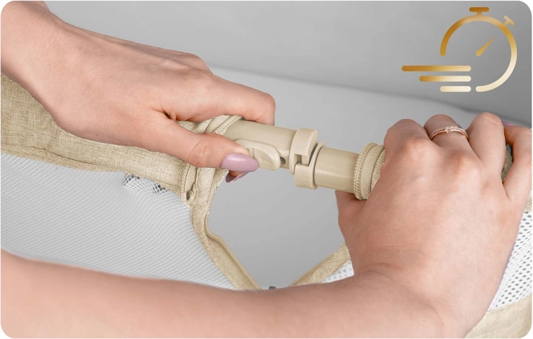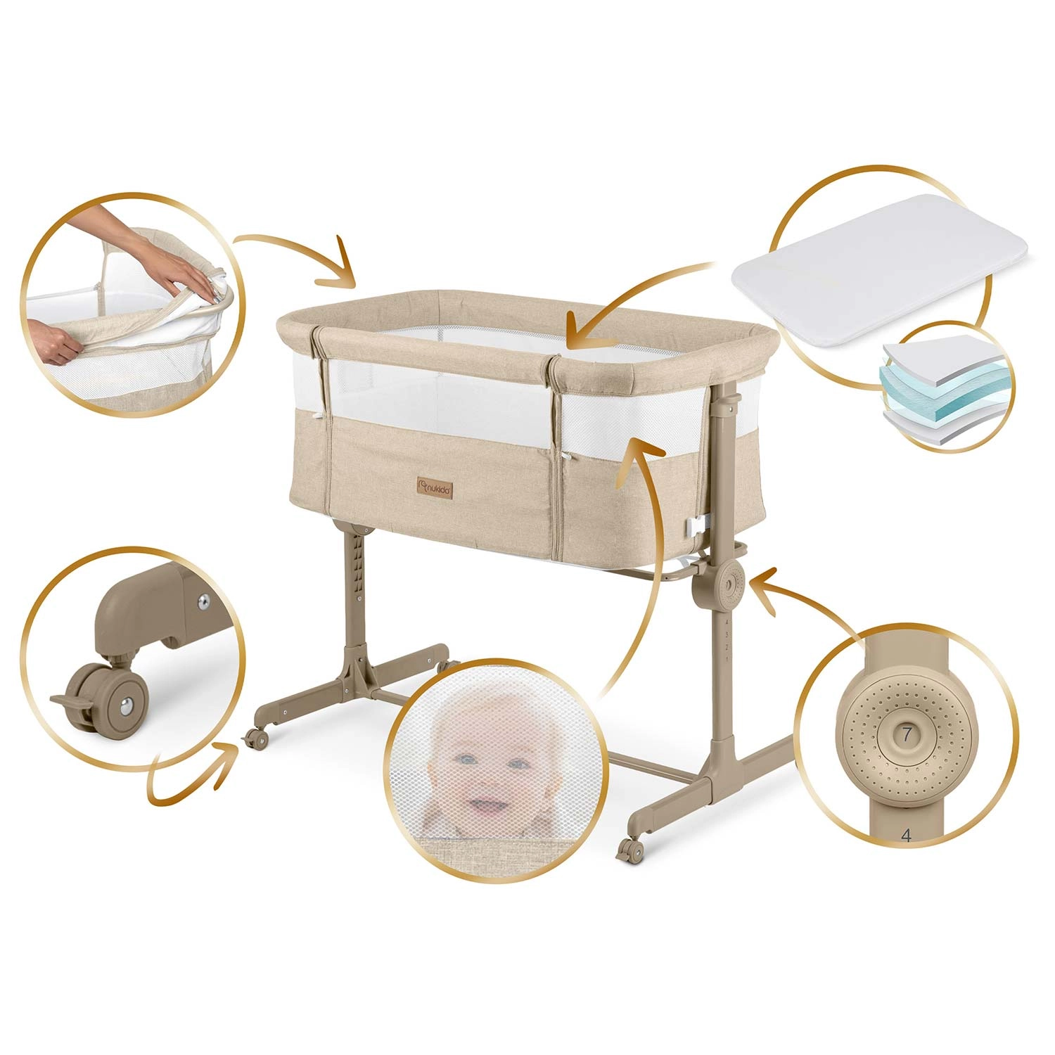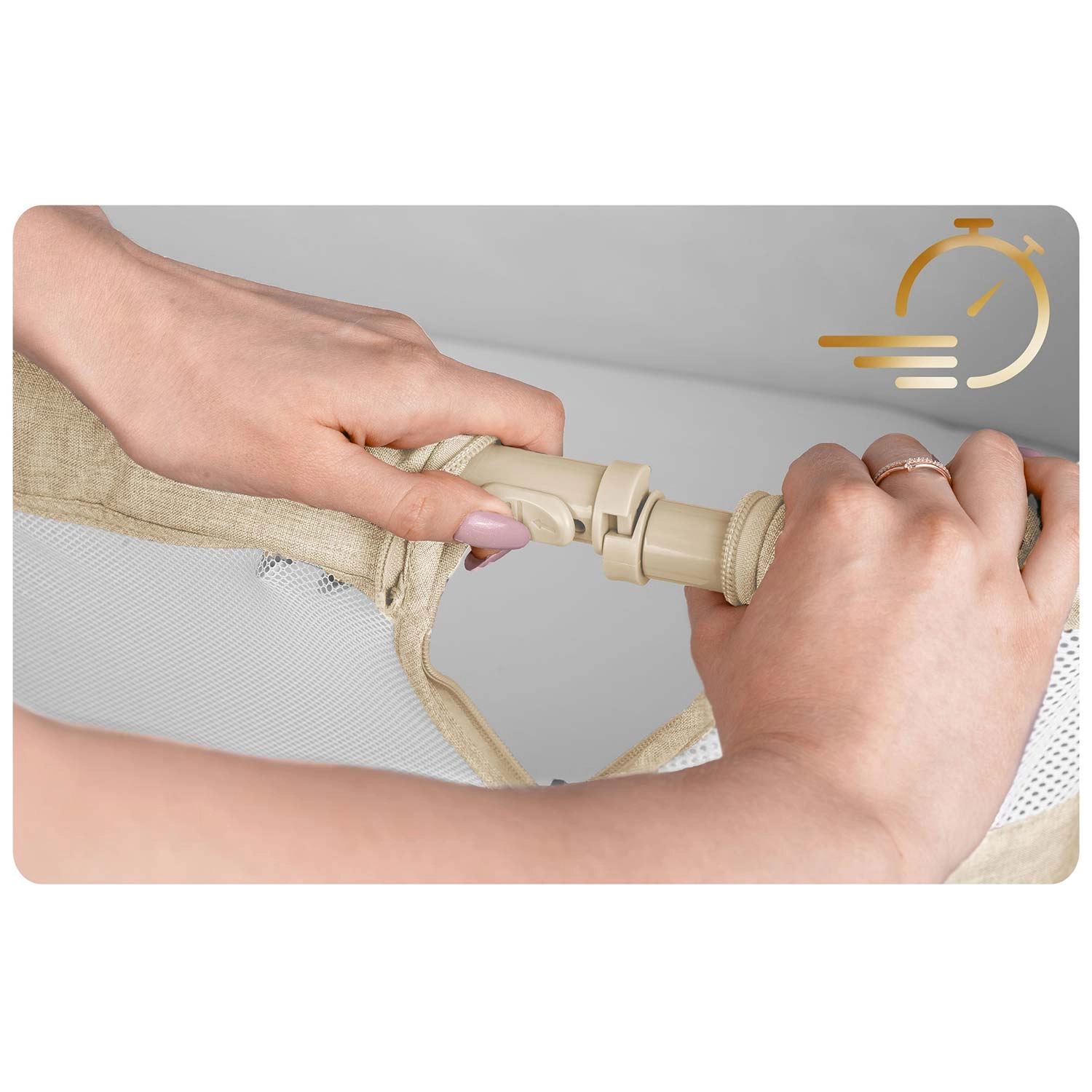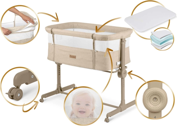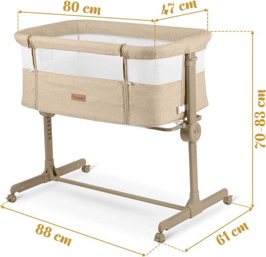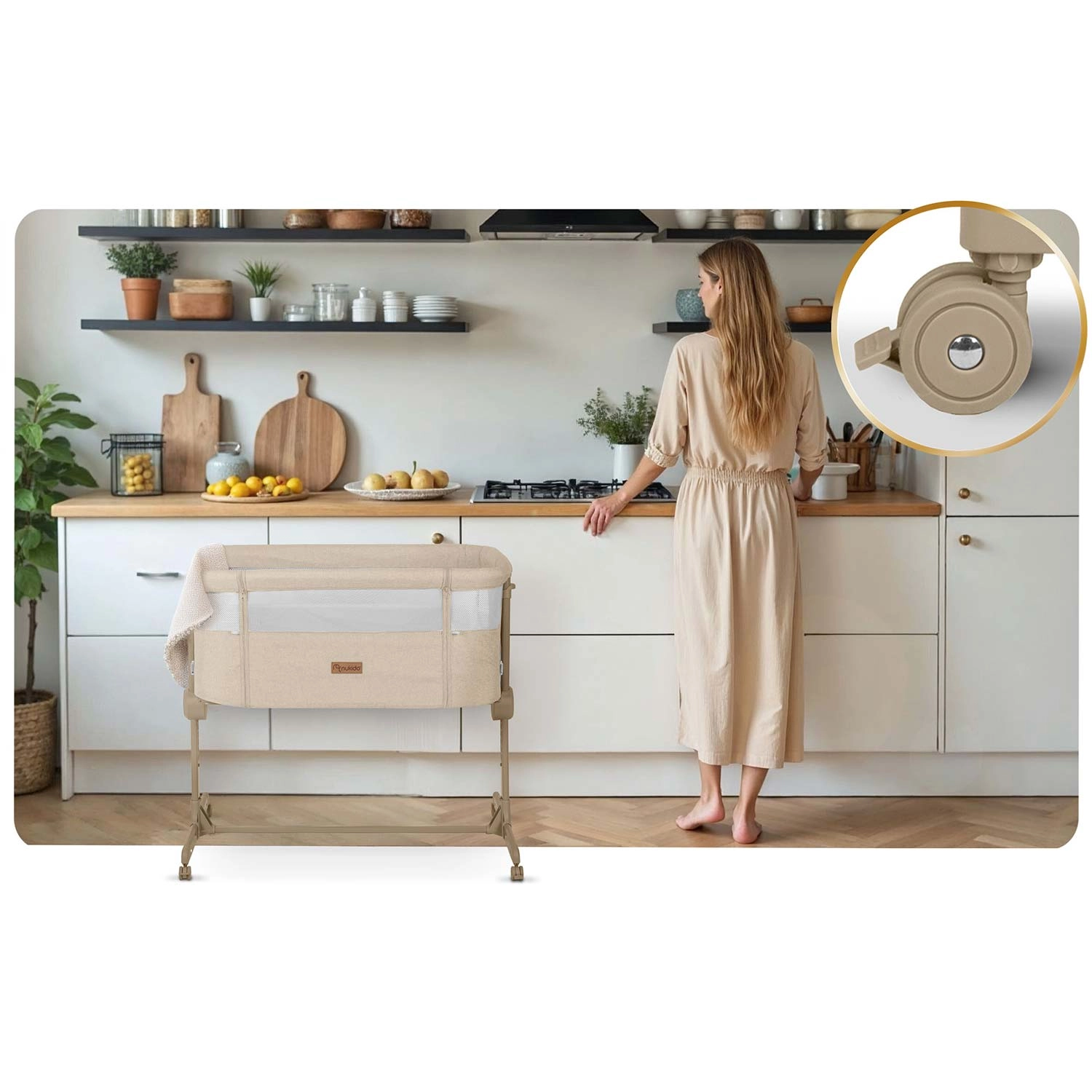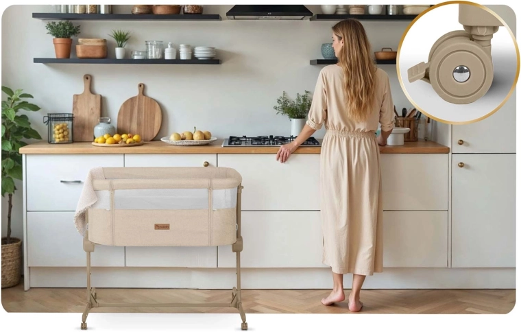 Vuggen klappes sammen på et øjeblik, og med hjul med bremse flytter du den derhen, hvor du har brug for den – til soveværelset, stuen eller legehjørnet. Den aftagelige sidepanel med udvendig lynlås giver nem adgang til babyen og forhindrer samtidig utilsigtet åbning indefra. Madrassen med vaskbart betræk hjælper med at holde perfekt hygiejne hver dag.