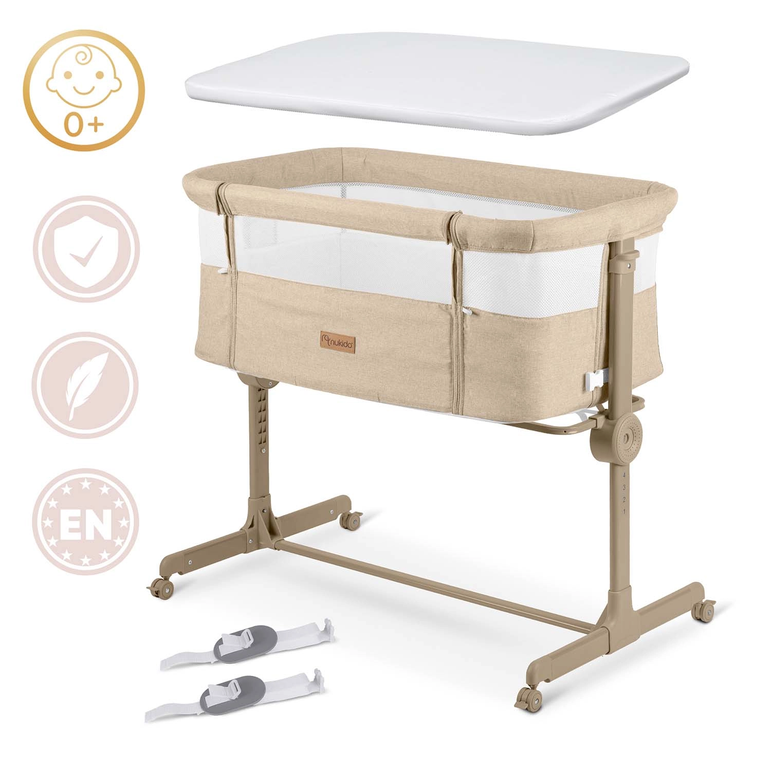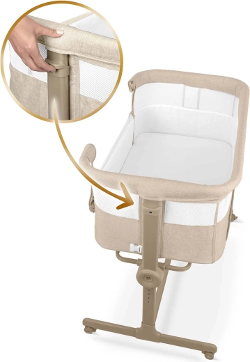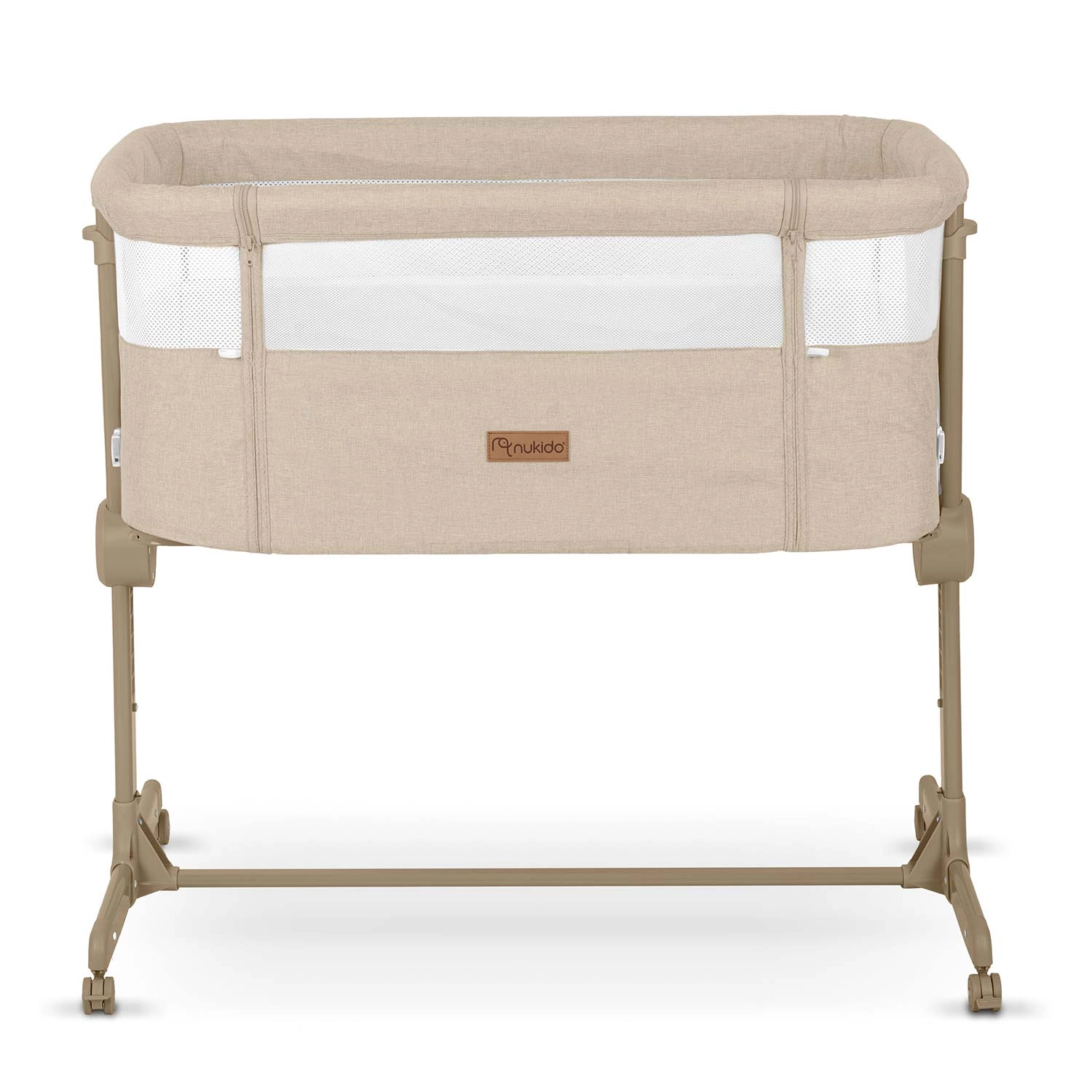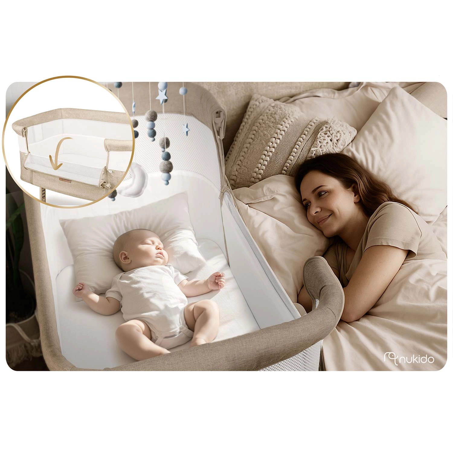 Fastgør babyen sikkert ved din seng og nyd roligere nætter. NUKIDO bedside-vuggen har en stabil ramme, åndbare netsider for bedre luftcirkulation og et fremragende overblik over barnet. Med uafhængig tosidet højderegulering matcher du let højden med forældrenes madras eller skaber en let hældning, som f.eks. kan hjælpe ved refluks.