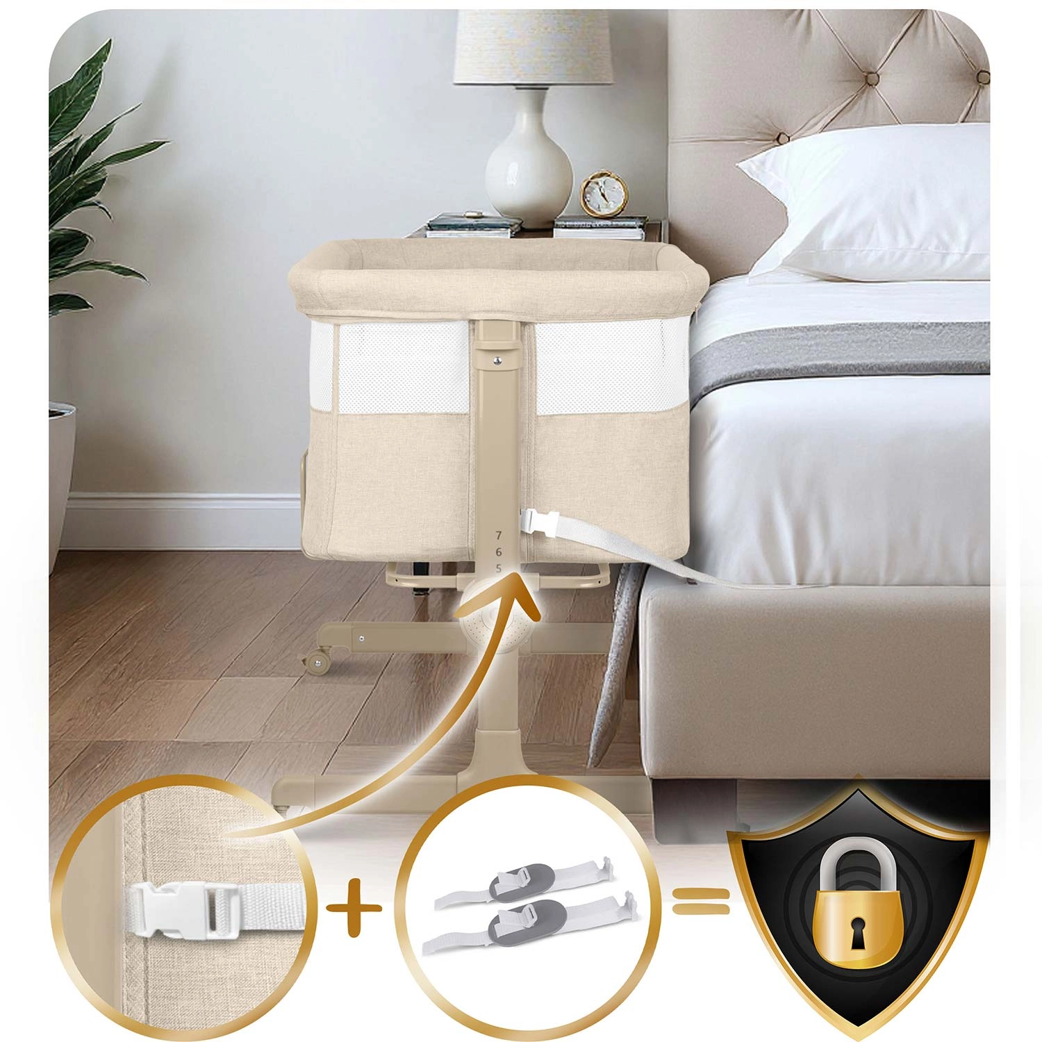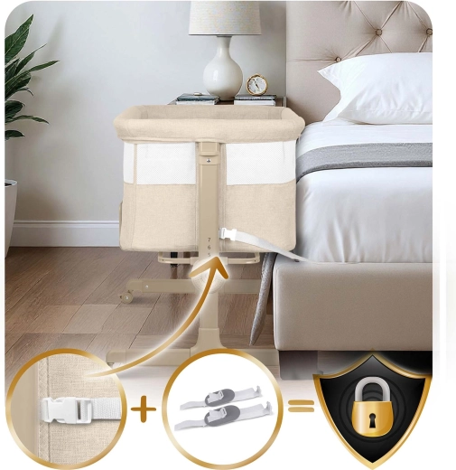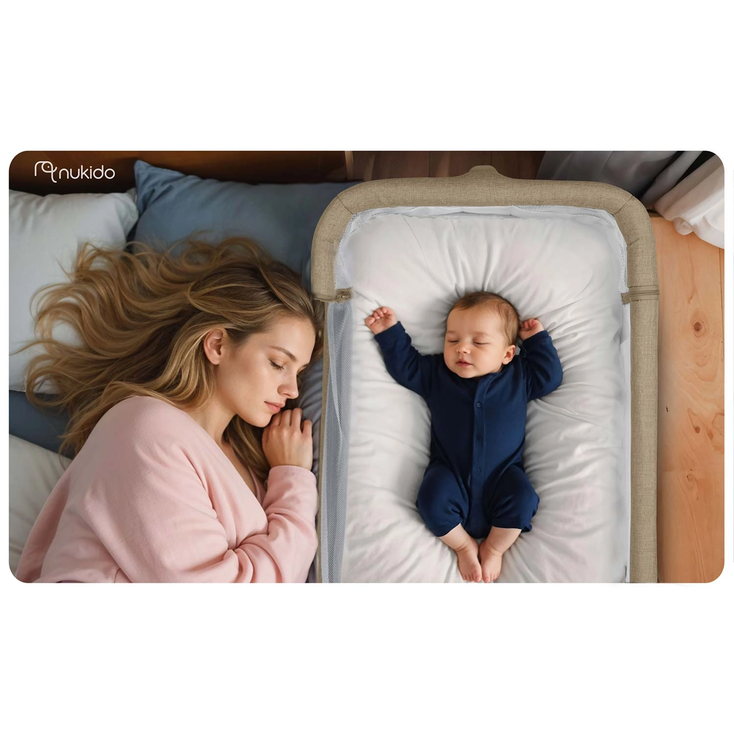 Fastgør babyen sikkert ved din seng og nyd roligere nætter. NUKIDO bedside-vuggen har en stabil ramme, åndbare netsider for bedre luftcirkulation og et fremragende overblik over barnet. Med uafhængig tosidet højderegulering matcher du let højden med forældrenes madras eller skaber en let hældning, som f.eks. kan hjælpe ved refluks.