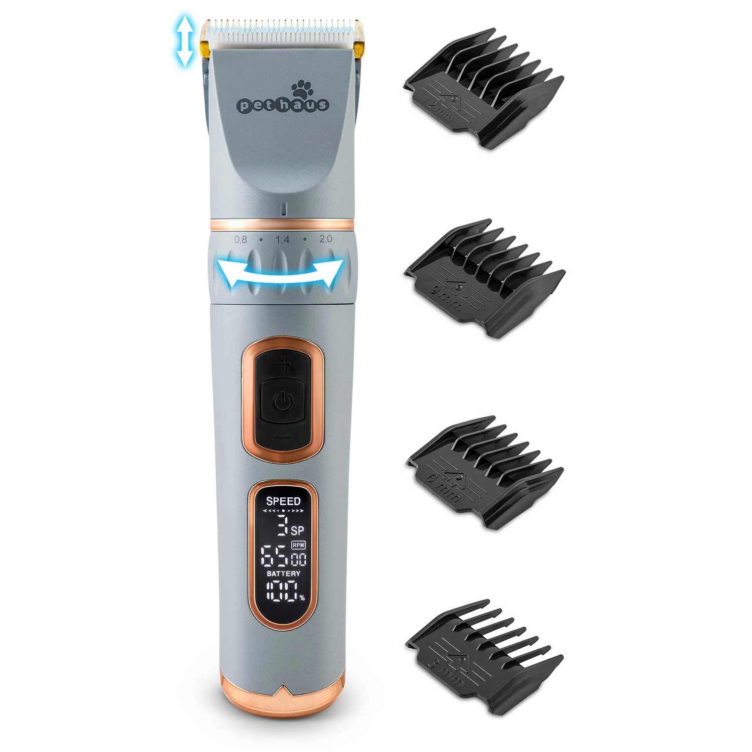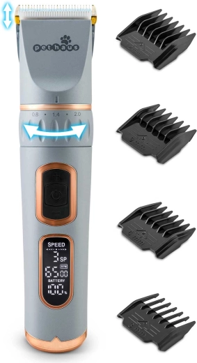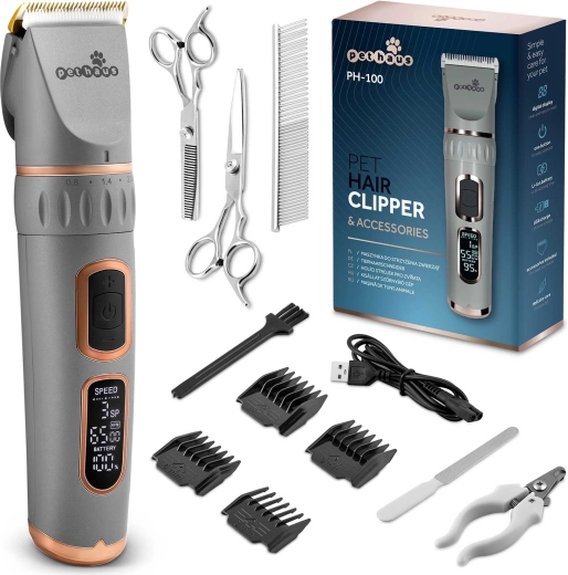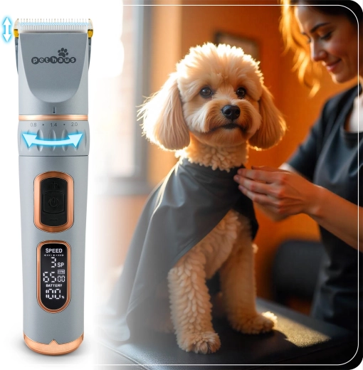 PETHAUS PH-100 er en pålidelig trimmer til hunde og katte, der kombinerer høj ydeevne med stille drift, så klipningen bliver så behagelig som muligt for dit kæledyr. De holdbare stålblade sikrer et præcist og glat snit uden at trække, og LCD-skærmen viser batteristatus, hastighed og tilstand, så du altid har fuld kontrol.