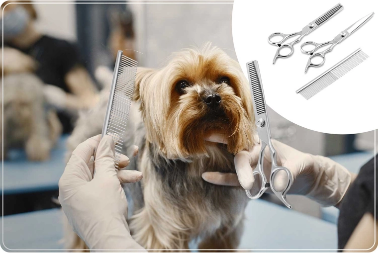 - Rigt tilbehør – 4 afstandskamme, rensebørste; sættet indeholder også saks, udtyndingssaks, kam samt klosaks og fil til komplet pleje.