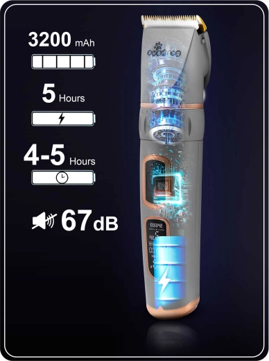 Takket være det 3200 mAh Li‑Ion-batteri arbejder den i op til 5 timer på en enkelt opladning og oplades fuldt via USB‑C på cirka 5 timer. Justering af klippelængde 0,8–2,0 mm direkte på trimmeren og fire afstandskamme (3, 6, 9 og 12 mm) gør det muligt præcist at tilpasse både pelstype og ønsket stil.