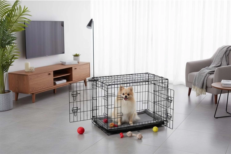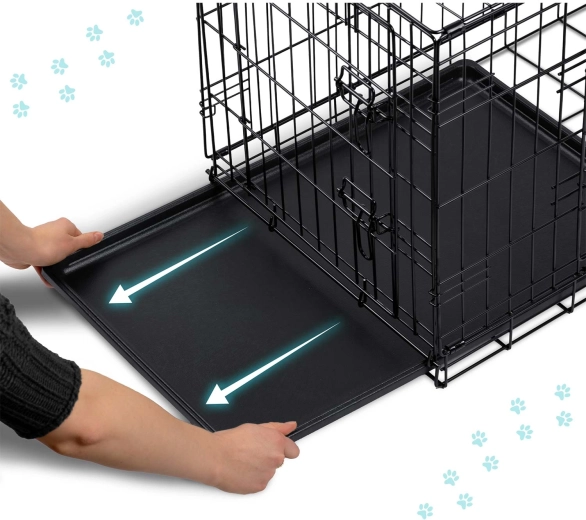 Buret kan på få sekunder foldes sammen til en flad “kuffertform” med praktisk håndtag. Den aftagelige plastbakke muliggør hurtig rengøring og god hygiejne både hjemme og under rejser. Konstruktionen i trådnet sikrer luftcirkulation og overblik, hvilket hjælper med at reducere hundens stress.