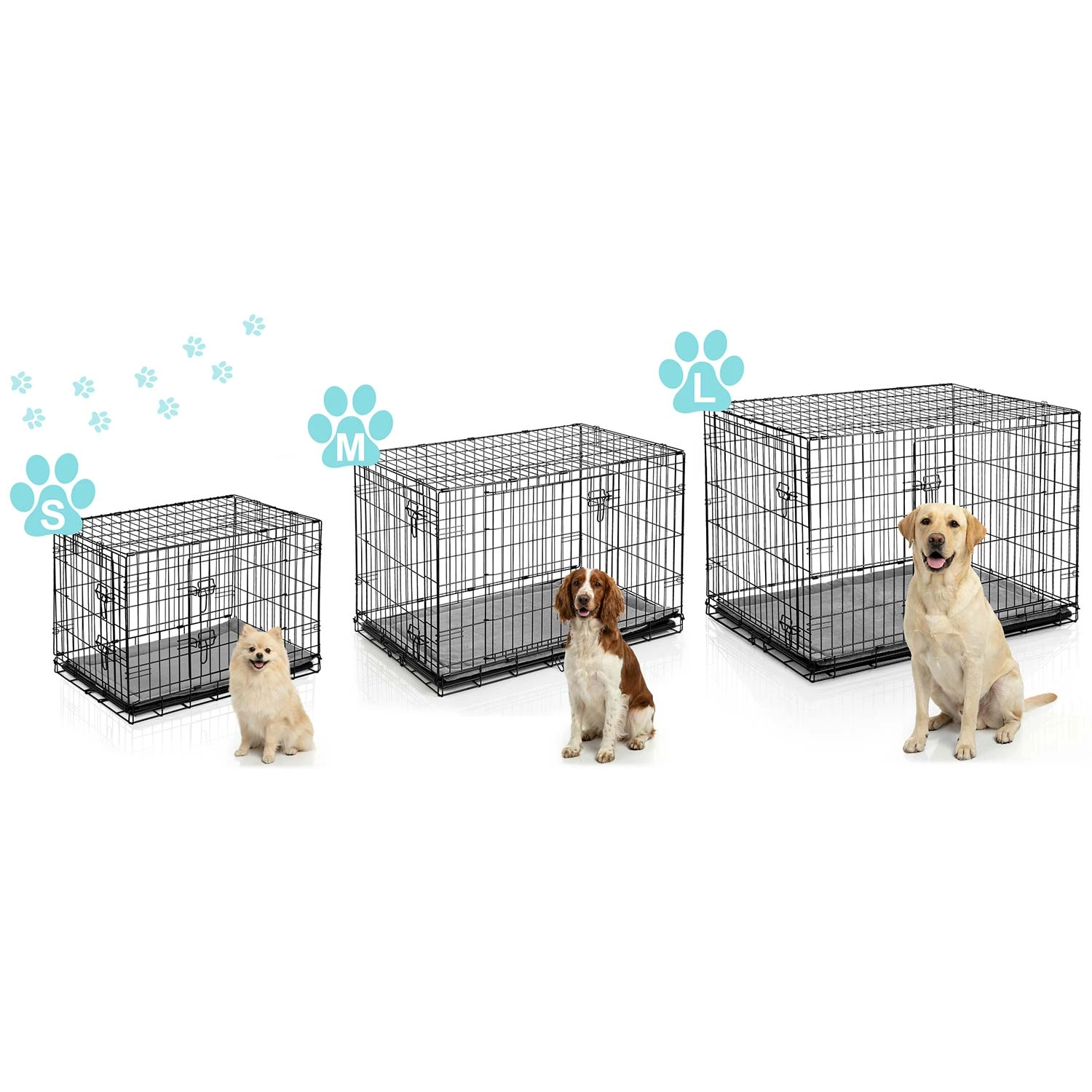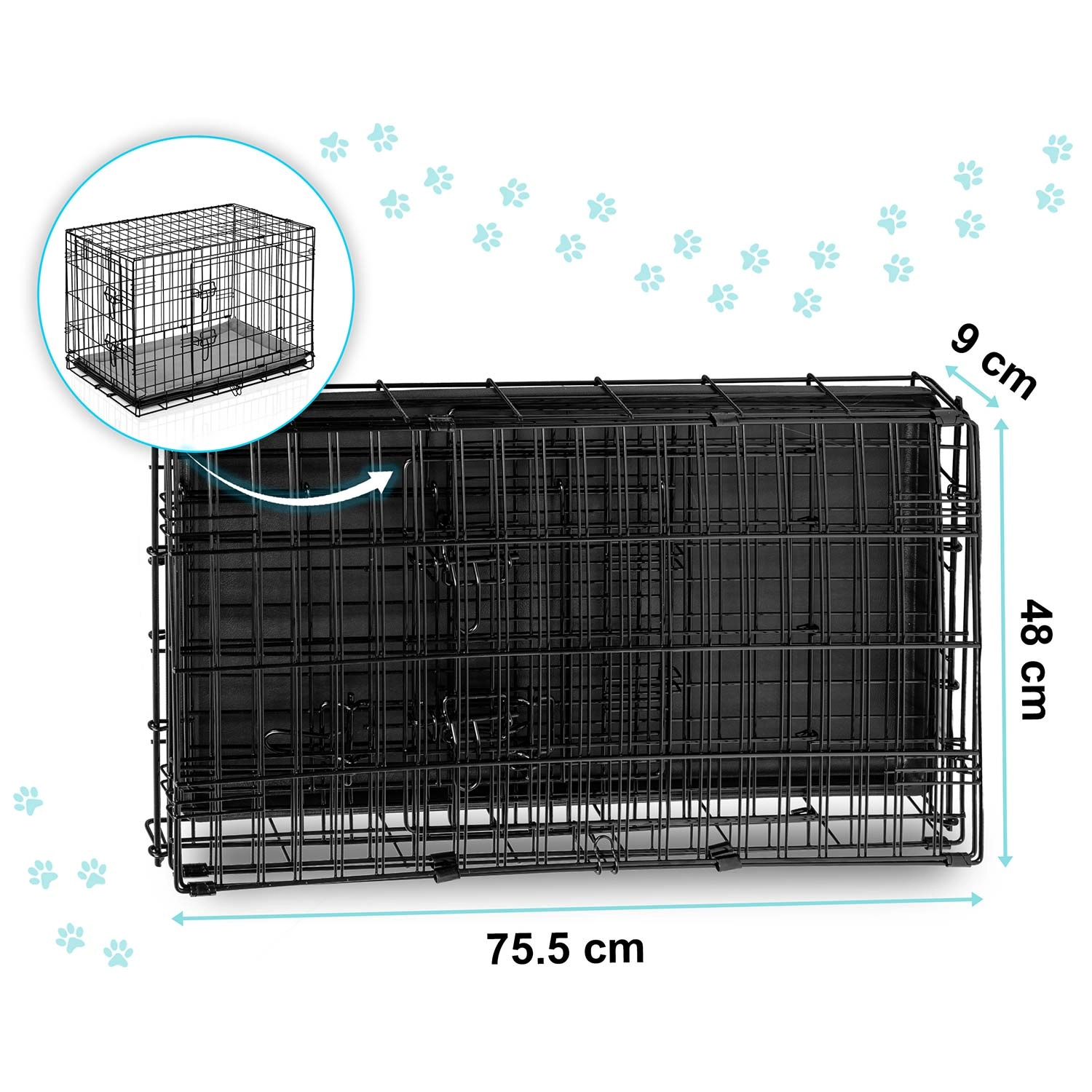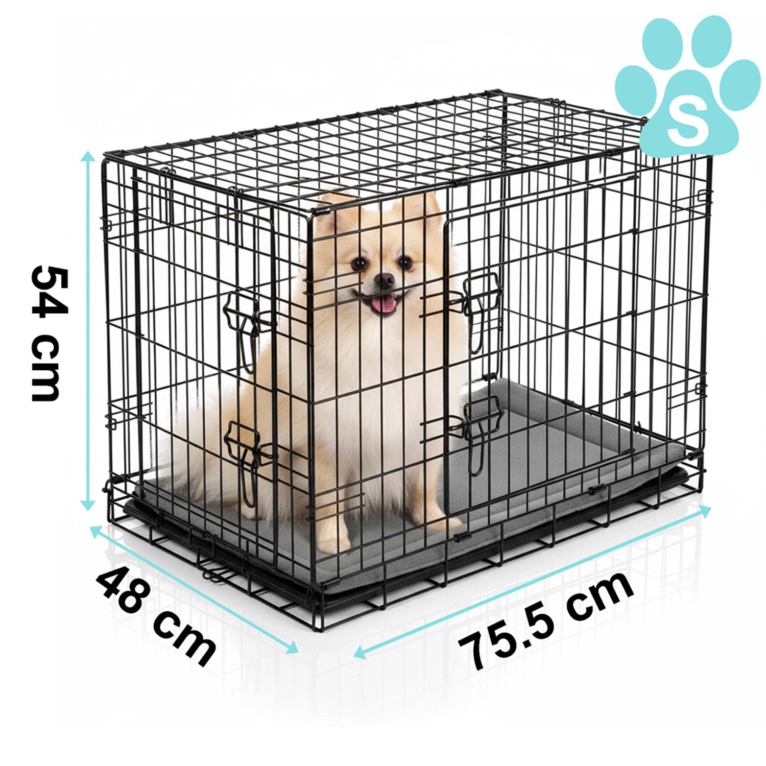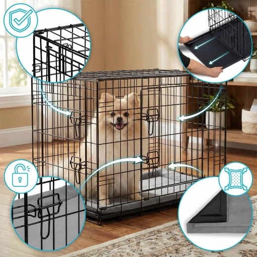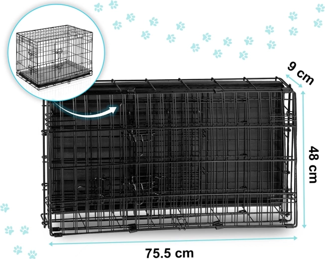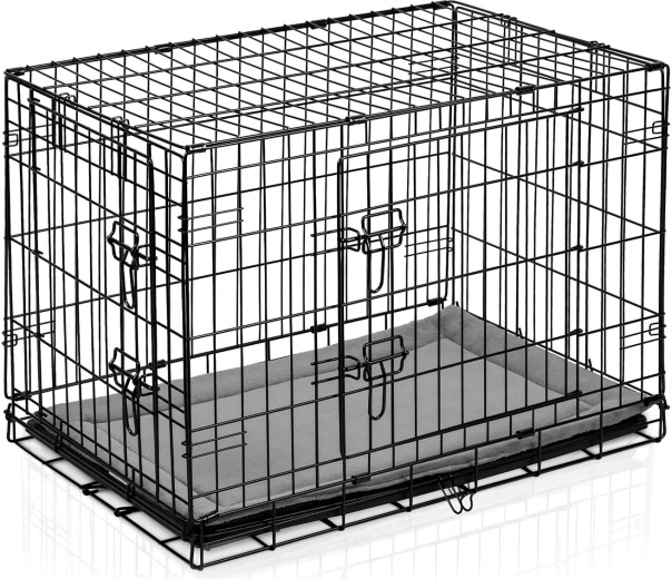 Praktisk og robust kennelbur med blød pude til små hunde, der giver sikkerhed, komfort og fremragende ventilation derhjemme og på farten. To døre for nem adgang, udtræksbakke for hurtig rengøring og sammenklappelig konstruktion til fladt format med bærehåndtag sikrer bekvem brug. Ideelt til træning, hvile og sikker transport i bil.