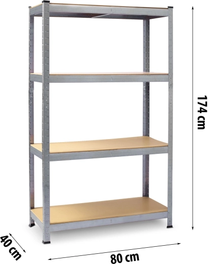 Hver af de 4 hylder bærer op til 150 kg. Galvaniserede profiler og midterforstærkninger sikrer høj stivhed og pålidelighed selv ved langvarig belastning.