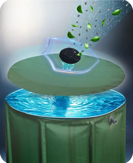 Det øverste låg med indløb til nedbør og integreret sigte opfanger blade og snavs. Vandet forbliver klart og klar til øjeblikkelig brug i haven.