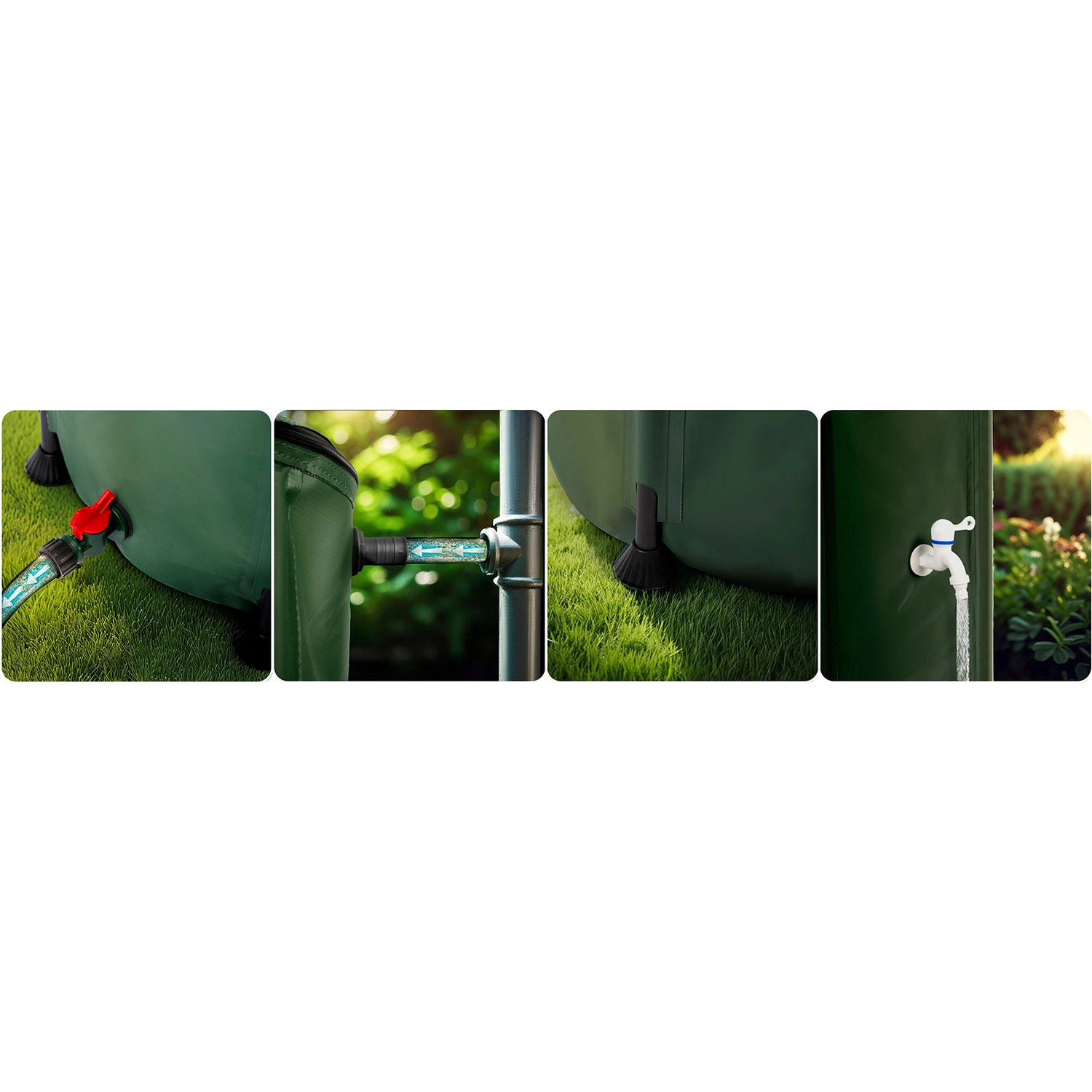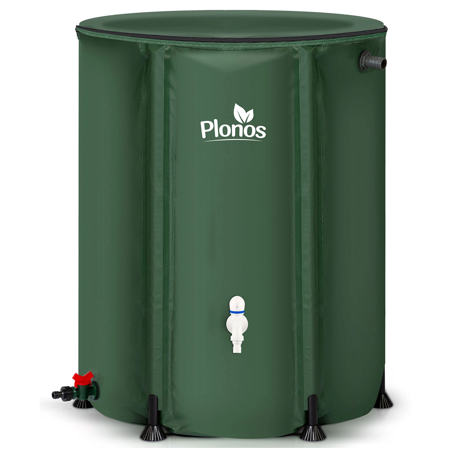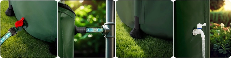 Praktiske betjeningselementer gør brugen bekvem: forreste hane med on/off-greb til hurtig fyldning af vandkander og en nedre aftapnings-/udløbsventil til tilslutning af haveslange og effektiv fordeling af vand i hele haven. Den sammenklappede tønde optager minimal plads og er derfor ideel til mindre haver og sæsonopbevaring.