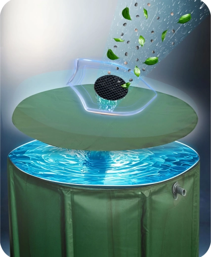 Den øverste åbning med si tilbageholder blade og snavs, så vandet forbliver rent til vanding af blomster, græsplæne og grøntsager.