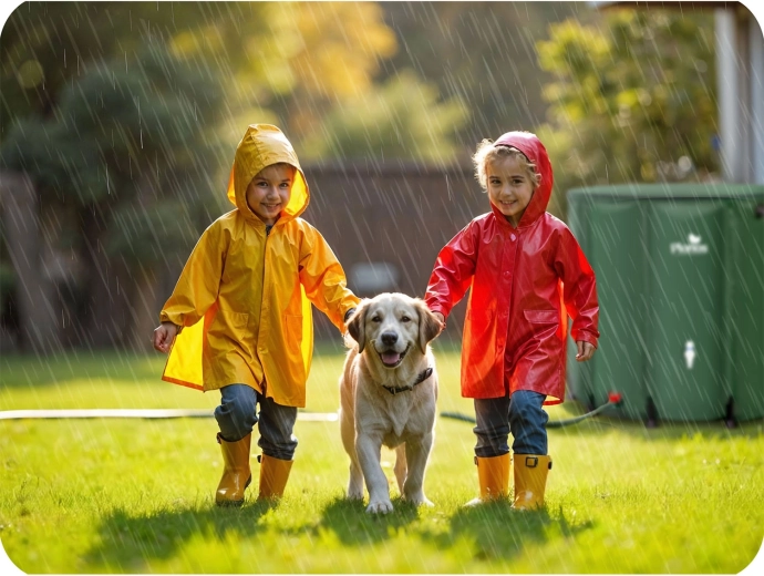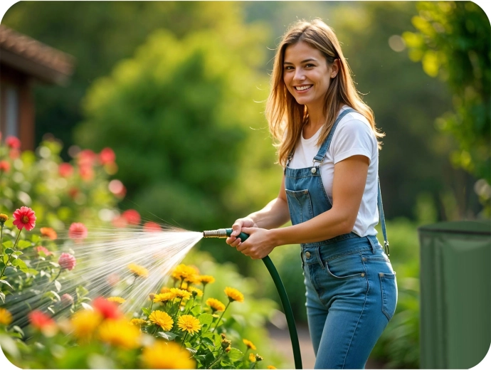 Med den praktiske hane og den nedre aftapningsventil fylder du nemt en vandkande, tilslutter en slange eller fordeler vandet ved hjælp af tyngdekraften ud på bedene. Den sammenklappelige konstruktion samles hurtigt og fylder minimalt efter sæsonen. Regnvand er naturligt blødt og uden klor – planterne elsker det, og du sparer både penge og miljø.