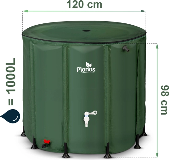 Opbevar regnvand smart og økonomisk. Denne sammenklappelige Plonos-tønde med en kapacitet på 1000 l tilbyder en solid og holdbar konstruktion, hane med on/off-ventil, nedre aftapningsventil til tilslutning af slange og UV- og vejrbestandigt betræk. Takket være nem montering og muligheden for tilslutning til tagrende får du rent regnvand til vanding af have og drivhus og spar­er op til 50 % af vandudgifterne samtidig.