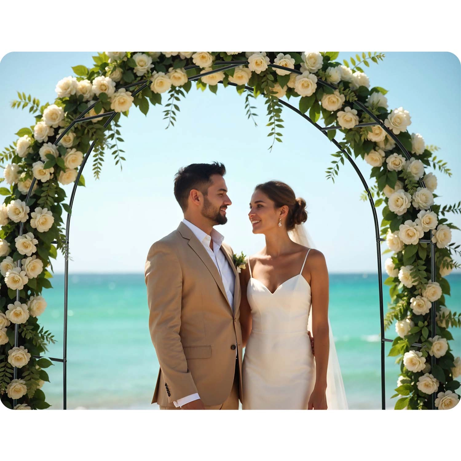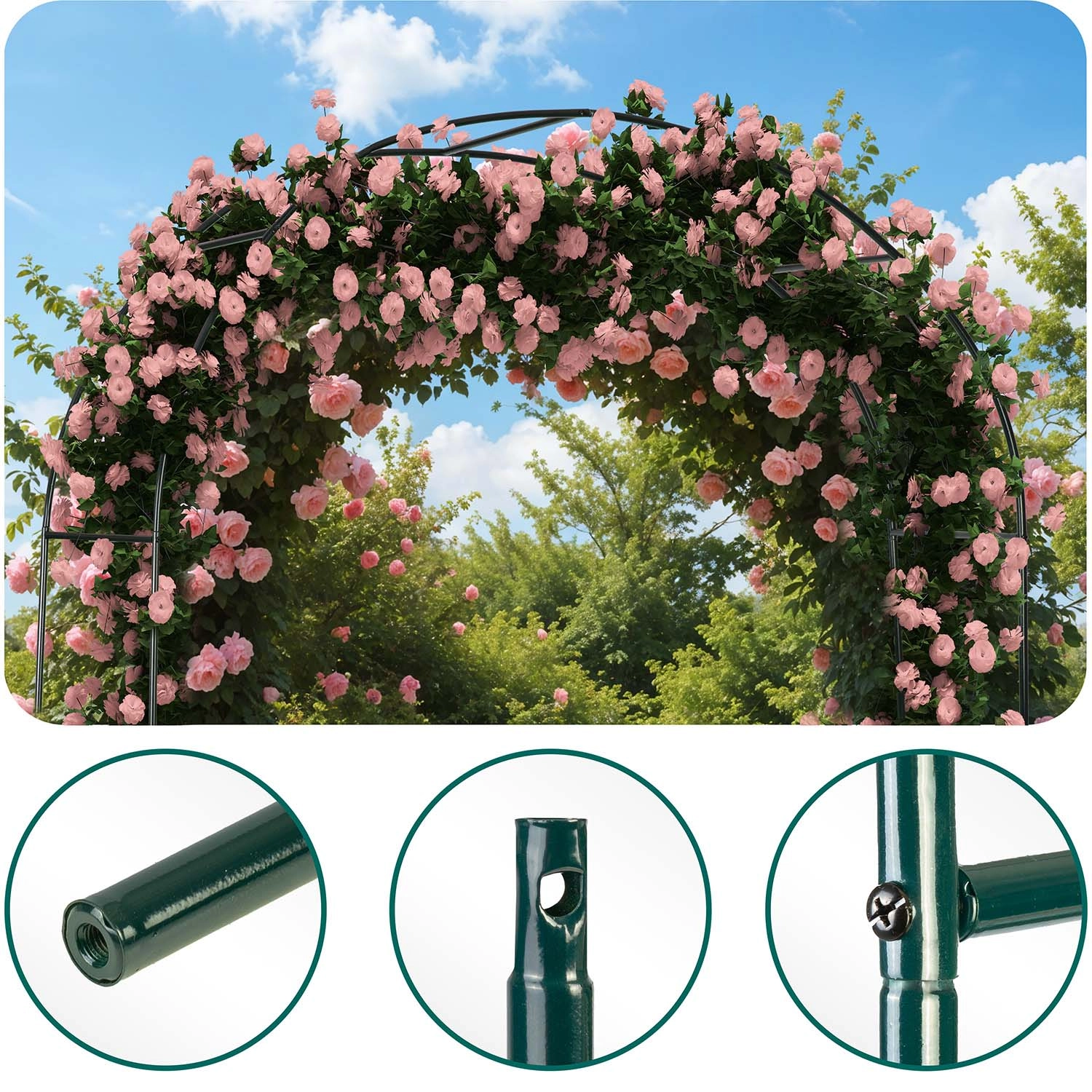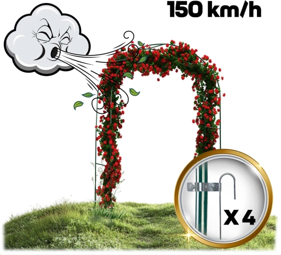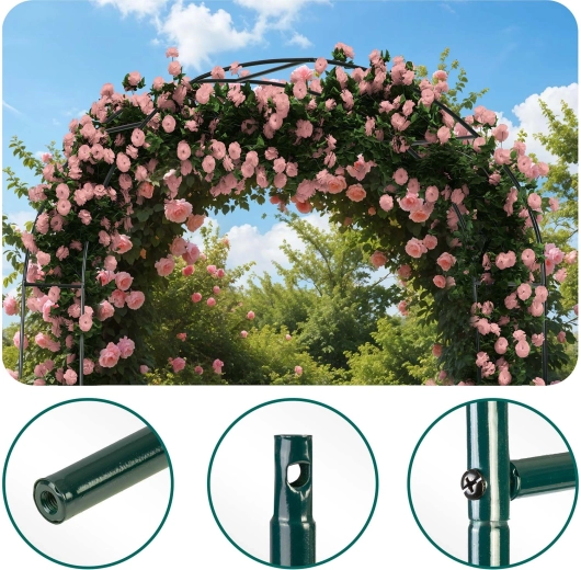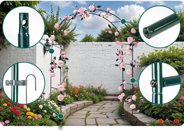 Takket være pulverlakeret stål er konstruktionen modstandsdygtig over for korrosion, regn og UV-stråling. Intuitiv montering kræver ikke specialværktøj, og pakken indeholder 4 jordankre og monteringsskruer til solid forankring. Du kan supplere pergolaen med lyskæder, bånd eller blomsterdekorationer og skabe en effektfuld opsætning til bryllupper, fester og daglig afslapning.