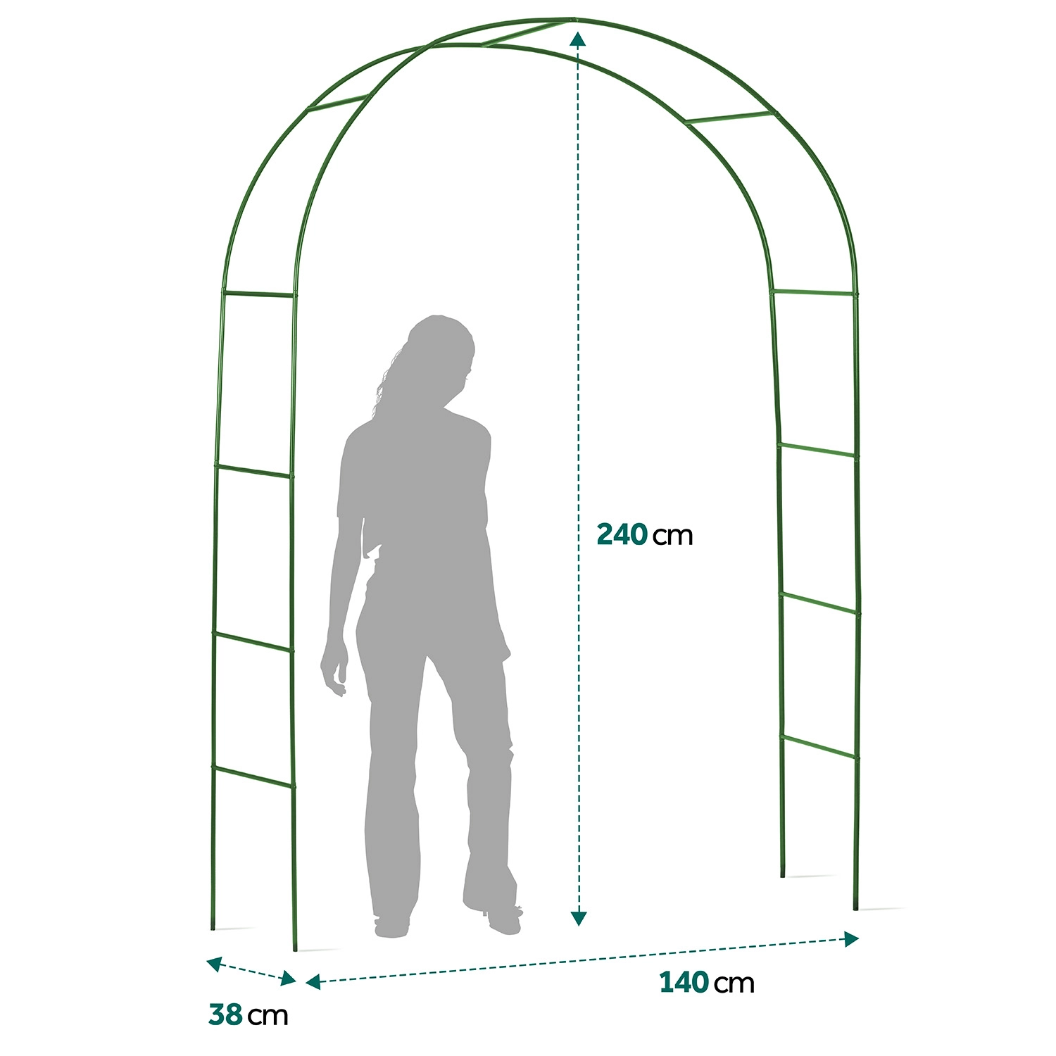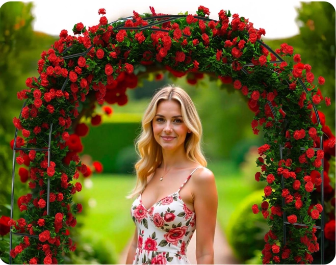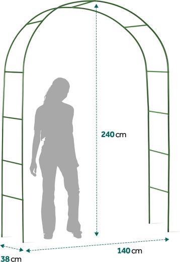 Denne stilfulde havepergola bliver et iøjnefaldende omdrejningspunkt ved havens indgang, langs stien eller som et dekorativt element ved en pavillon. Den minimalistiske buede form og mørkegrønne farve harmonerer naturligt med beplantningen og understøtter tæt vækst af klatreplanter, som skaber naturlig skygge og en hyggelig atmosfære.