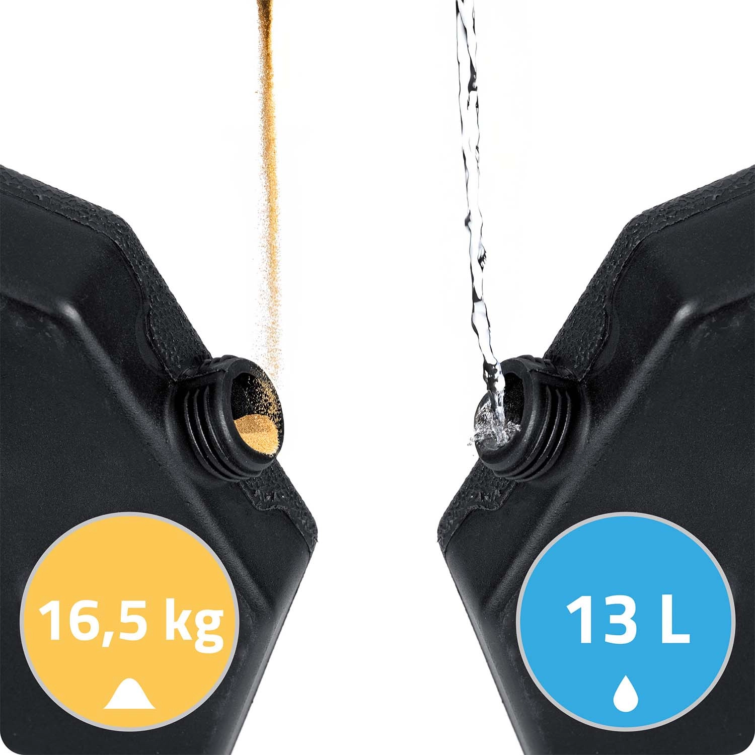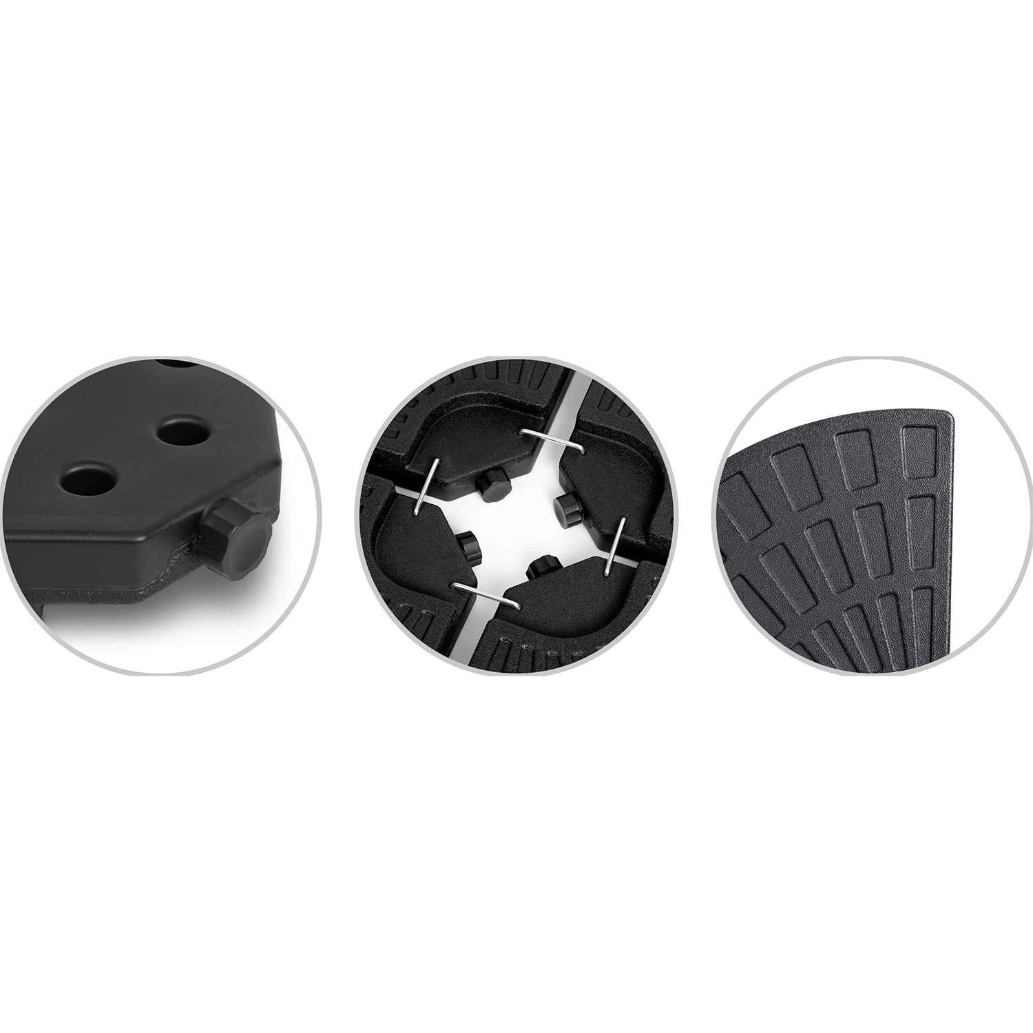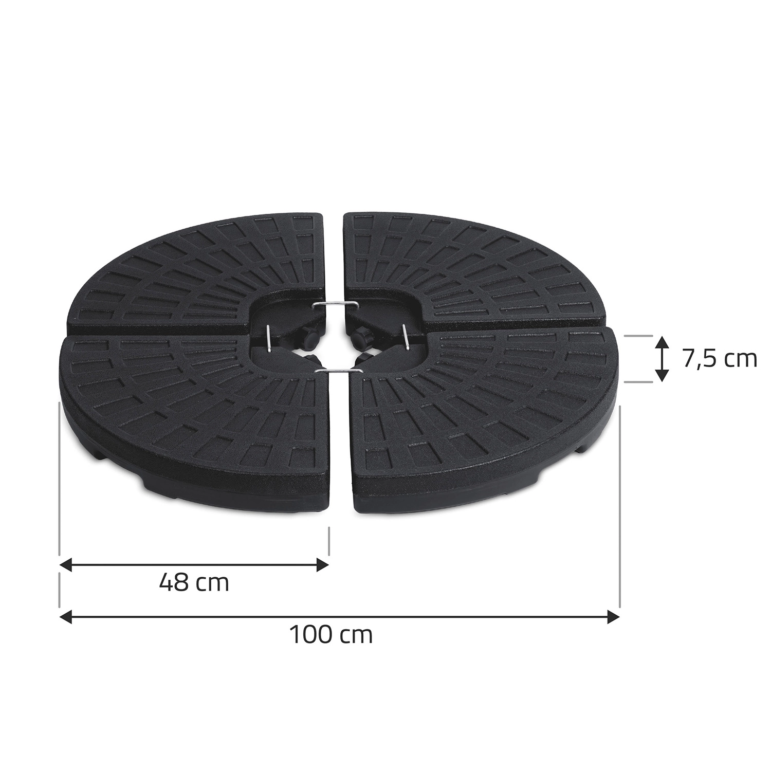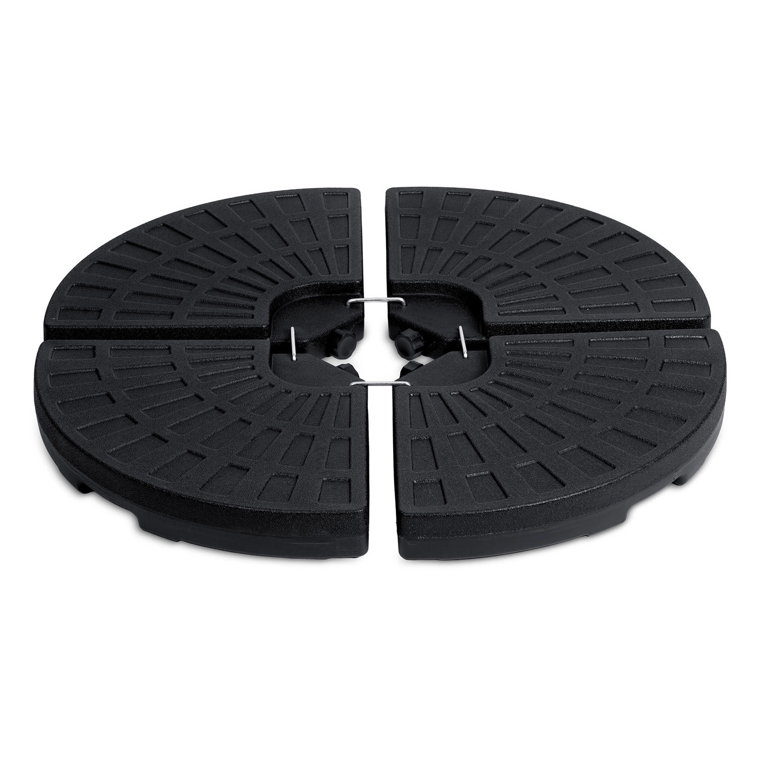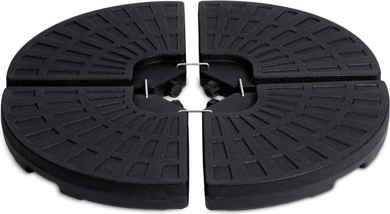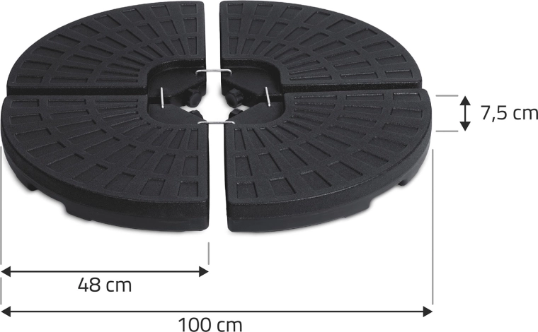 Monteringen er hurtig og intuitiv: De fire dele omslutter parasolstangen, og metalhager (medfølger) forbinder dem sikkert. Den teksturerede overflade øger grebet mod underlaget, og påfyldningsåbningerne muliggør nem påfyldning og tømning. Ideel til terrasser, haver og udendørsserveringer.