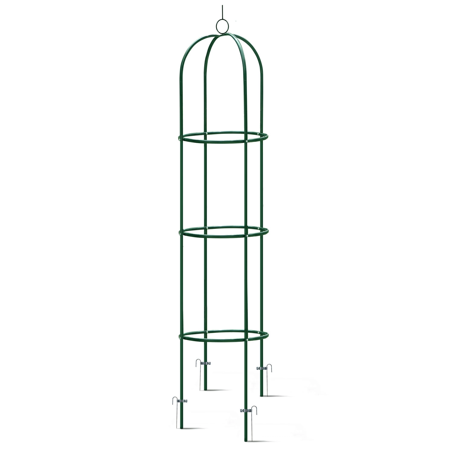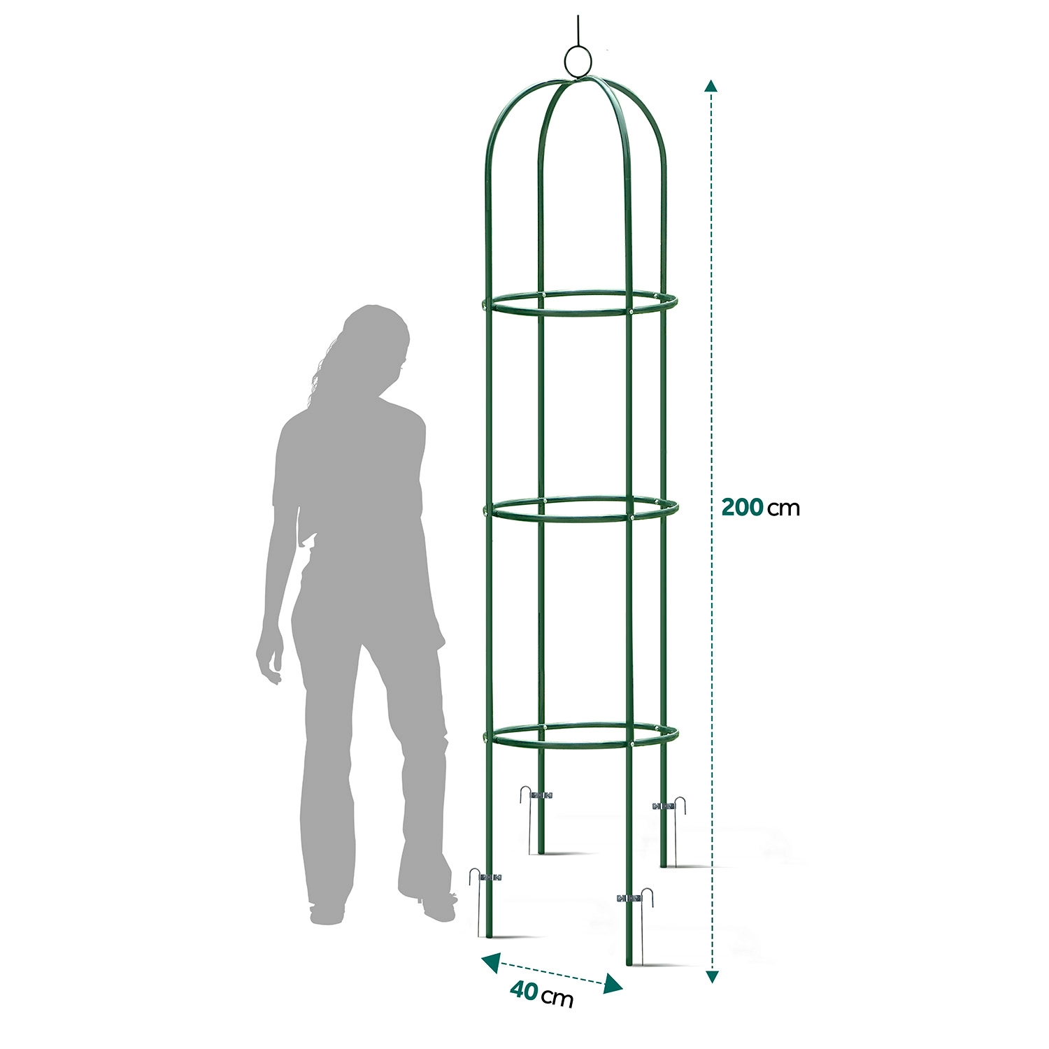 Monteringen er hurtig og intuitiv – du klarer den uden specialværktøj ved hjælp af det medfølgende monteringsmateriale og en overskuelig vejledning. Det kompakte fodaftryk på 40 × 40 cm passer både i bede og i store krukker på terrassen eller ved indgangen. Den mørkegrønne farve harmonerer naturligt med blade og blomster og fremhæver roser, klematis, blåregn og prydbønner.
