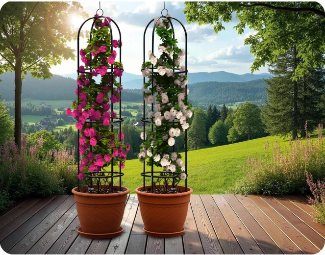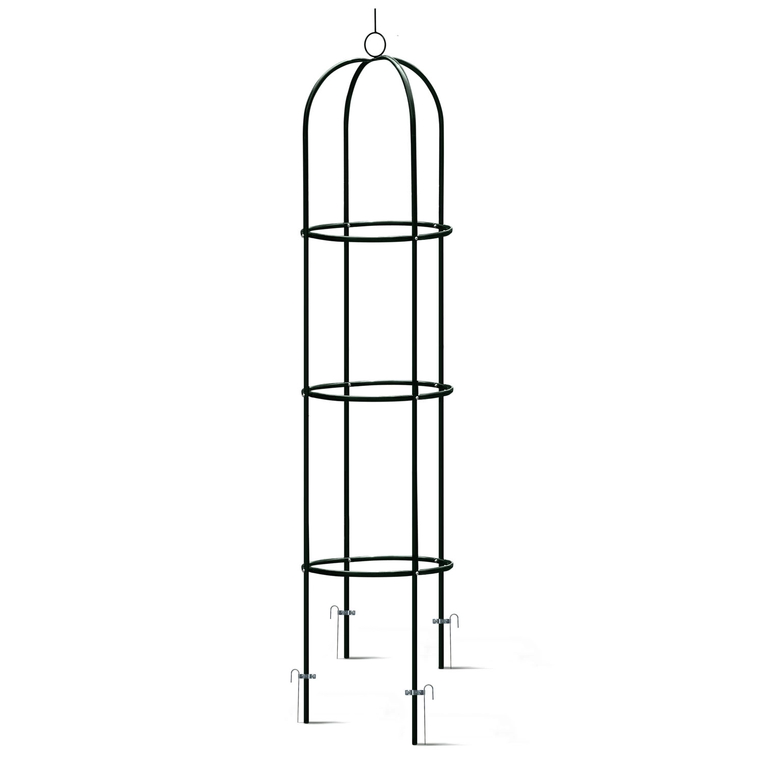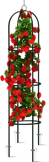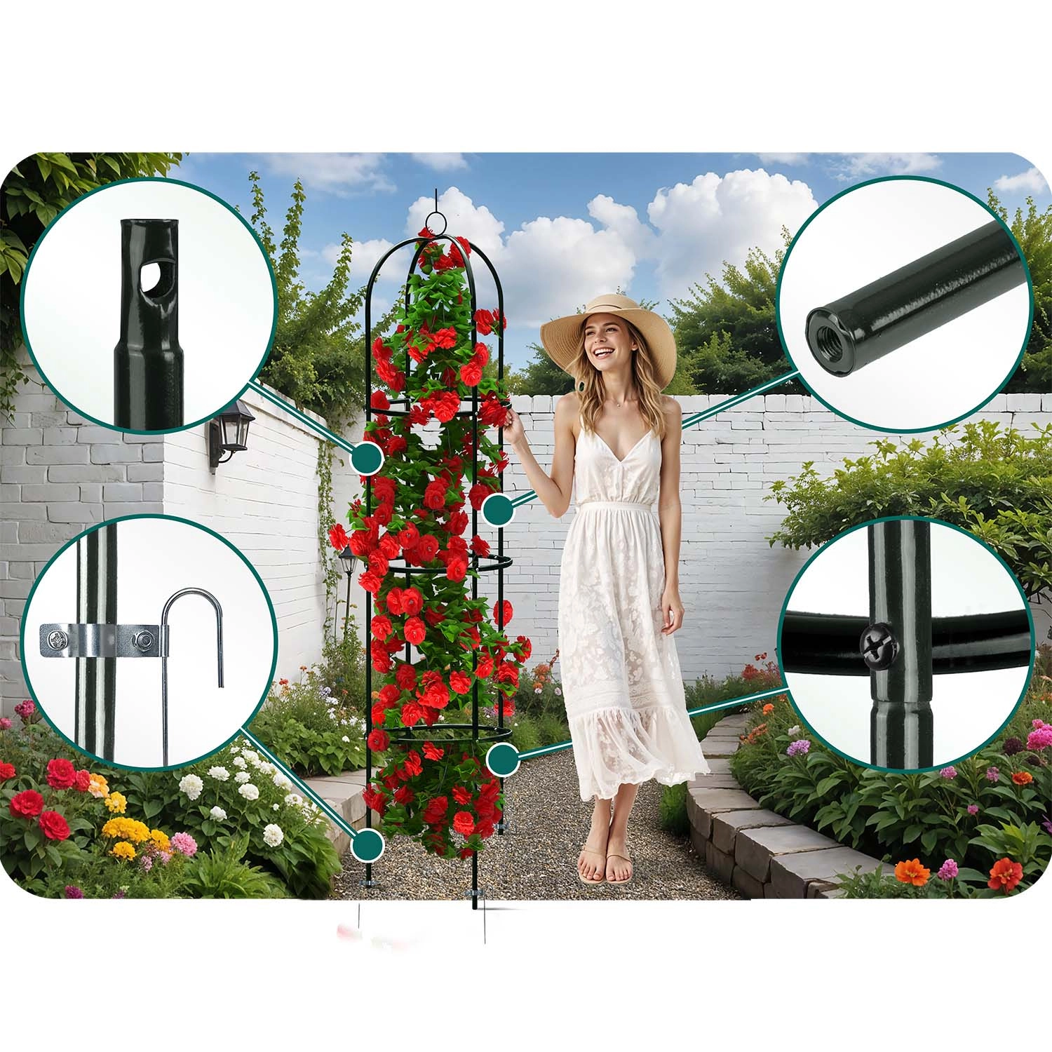 Tre cirkulære afstivninger og fire lodrette stænger giver en solid konstruktion, der fører planterne opad og fremmer rig blomstring.